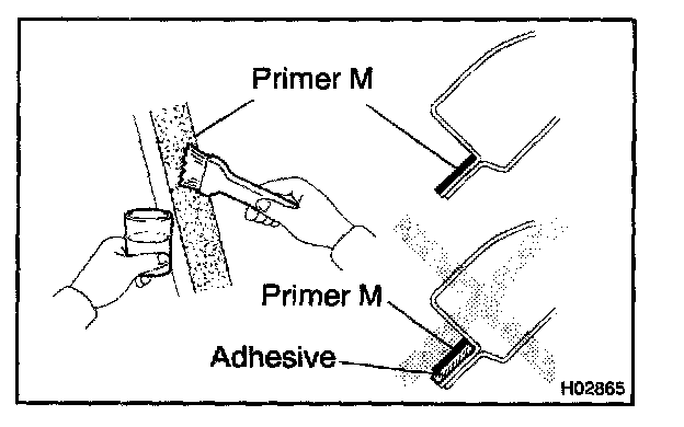 a. Using a brush or sponge, coat the edge of the glass and the contact surface with Primer G as shown in the illustration.