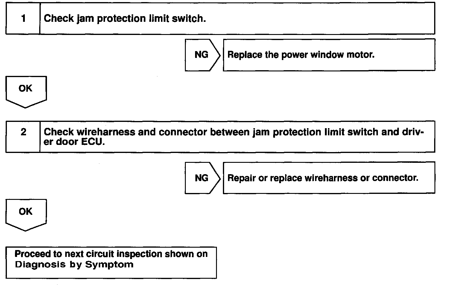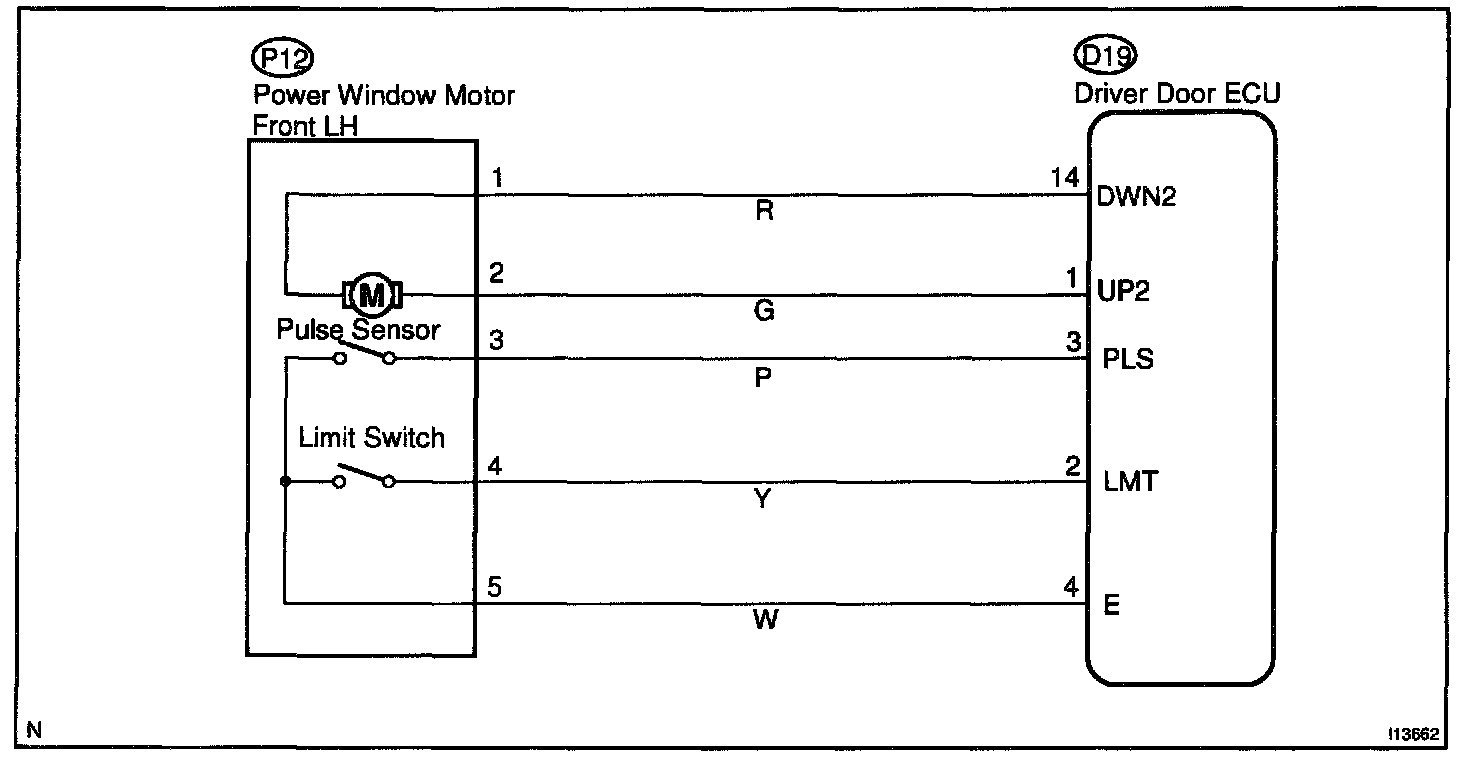 CIRCUIT DESCRIPTIONJam protection limit switch is built-in the power window motor. This switch functions to turn "OFF" before the top dead center, and ECU reads this "OFF" signal resulting in closing the window fully.