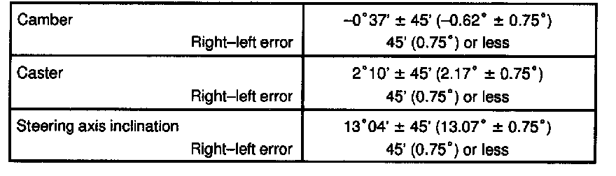 If the caster and steering axis inclination are not within the specified values, after the camber has been correctly adjusted, recheck the suspension parts for damaged and/or worn out parts.