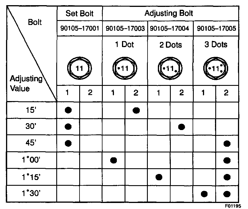 If the camber is not within the specified value, using the following table, estimate how much additional camber adjustment will be required, and select the camber adjusting bolt.