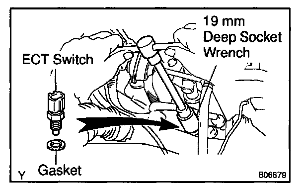 b. Using a 19 mm deep socket wrench, remove the ECT sensor and gasket.