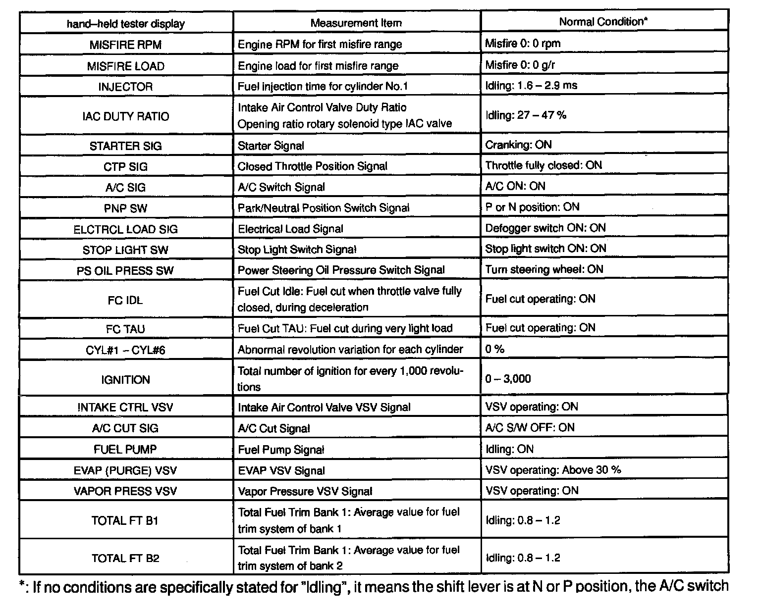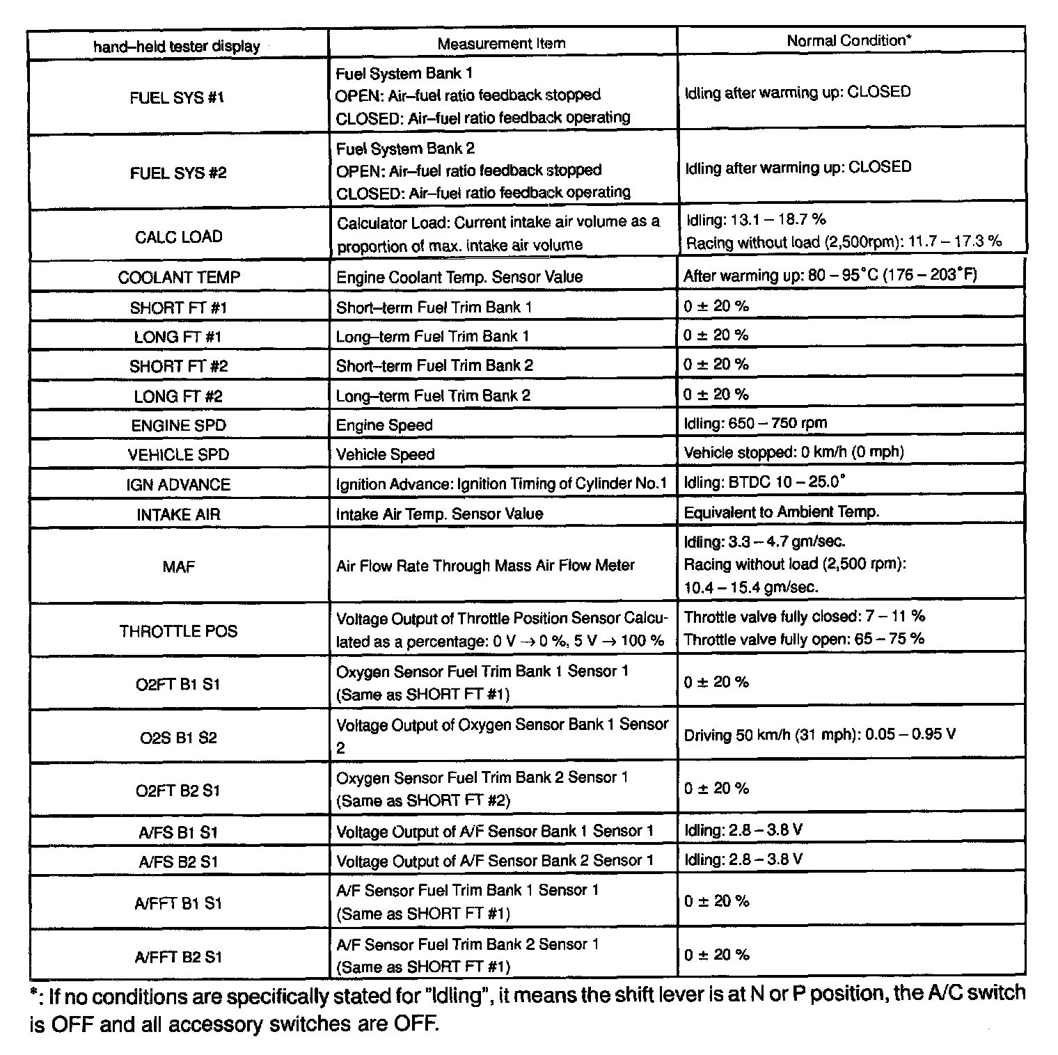 ENGINE OPERATING CONDITIONNOTE: The values given below for "Normal Condition" are representative values, so a vehicle may still be normal even if its value varies differ from those listed here. So do not decide whether a part is faulty or not solely according to the "Normal Condition" here.