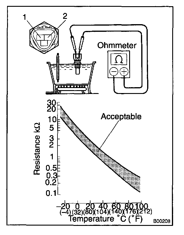Using an ohmmeter, measure the resistance between terminals 1 (E2) and 2 (THW).