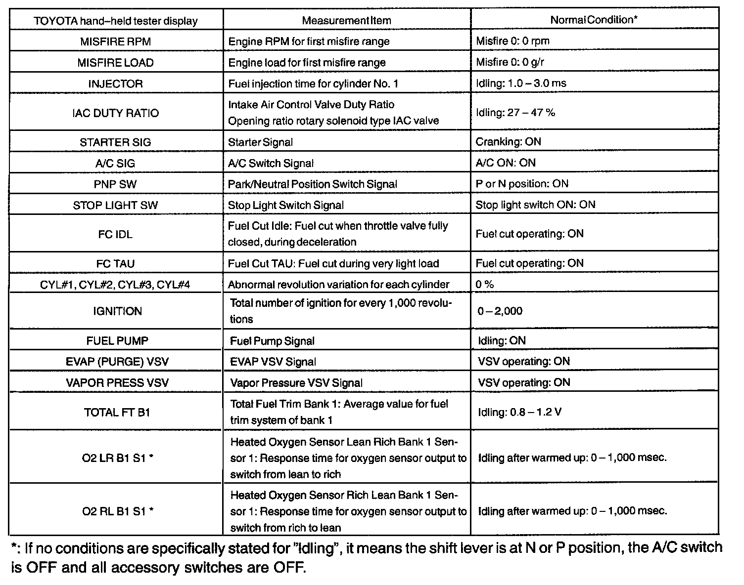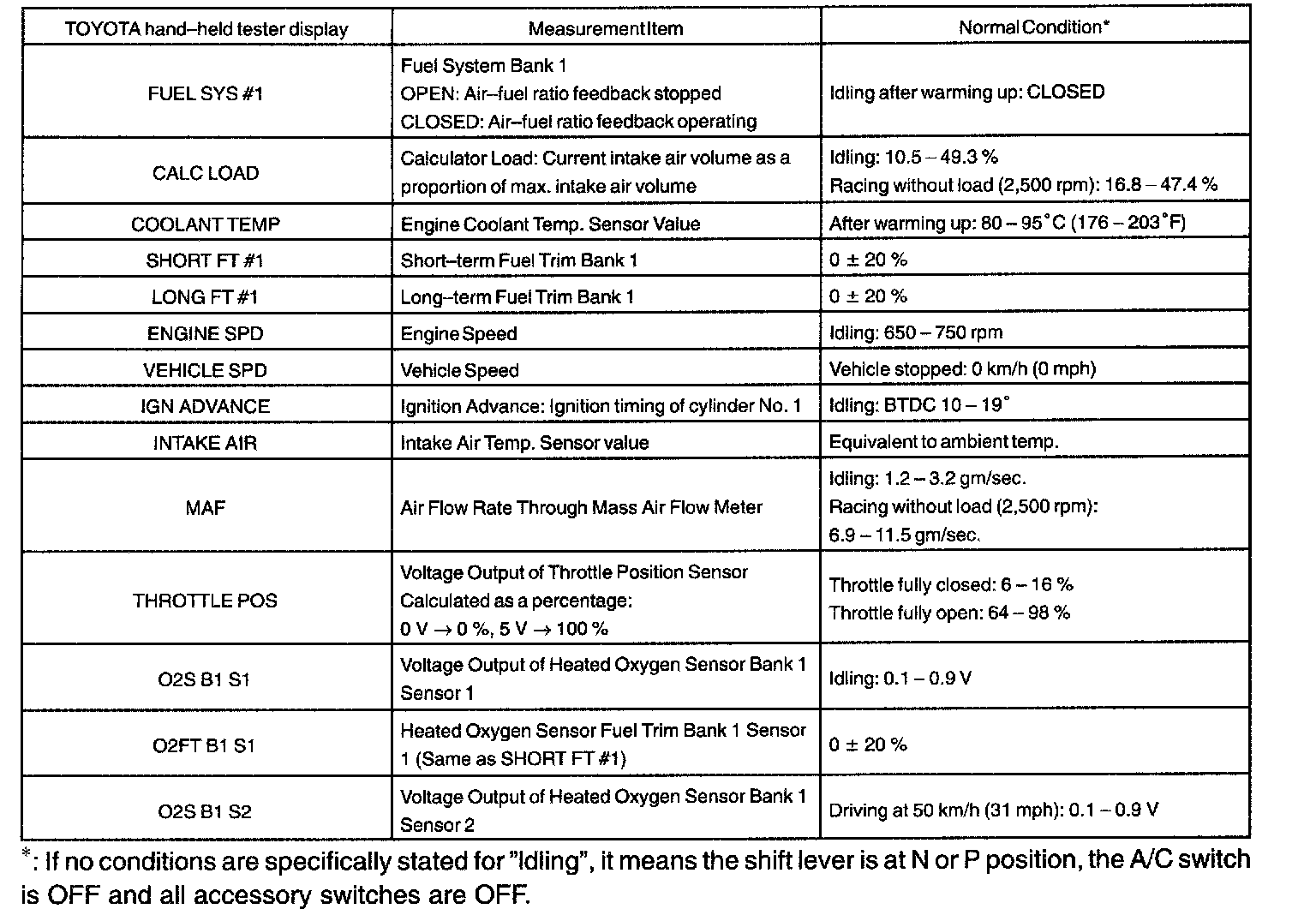 NORMAL ENGINE OPERATING CONDITIONSNOTE: The values given below for "Normal Condition" are representative values, so a vehicle may still be normal even if its value differs from those listed here. So do not decide whether a part is faulty or not solely according to the "Normal Condition" here.