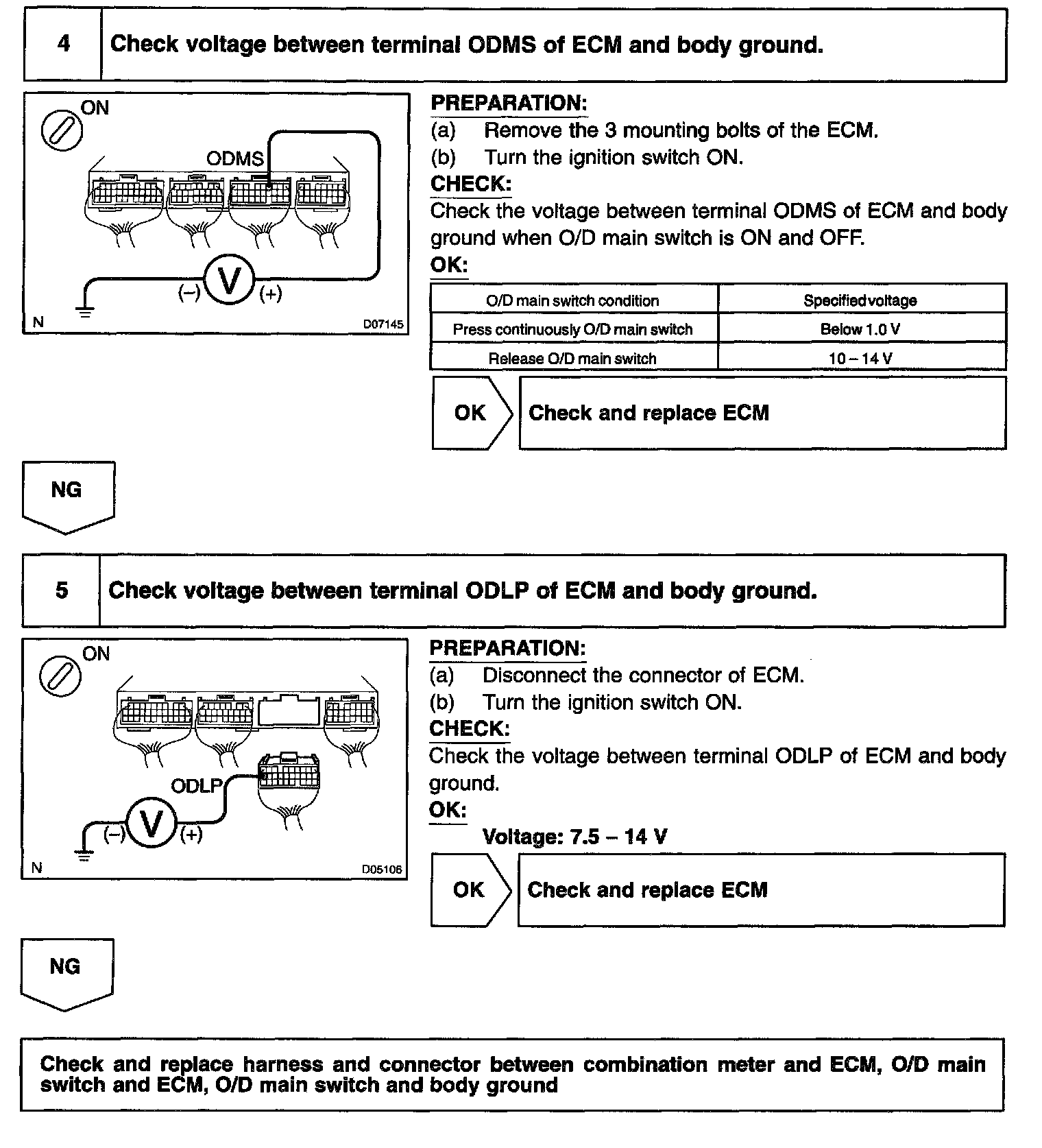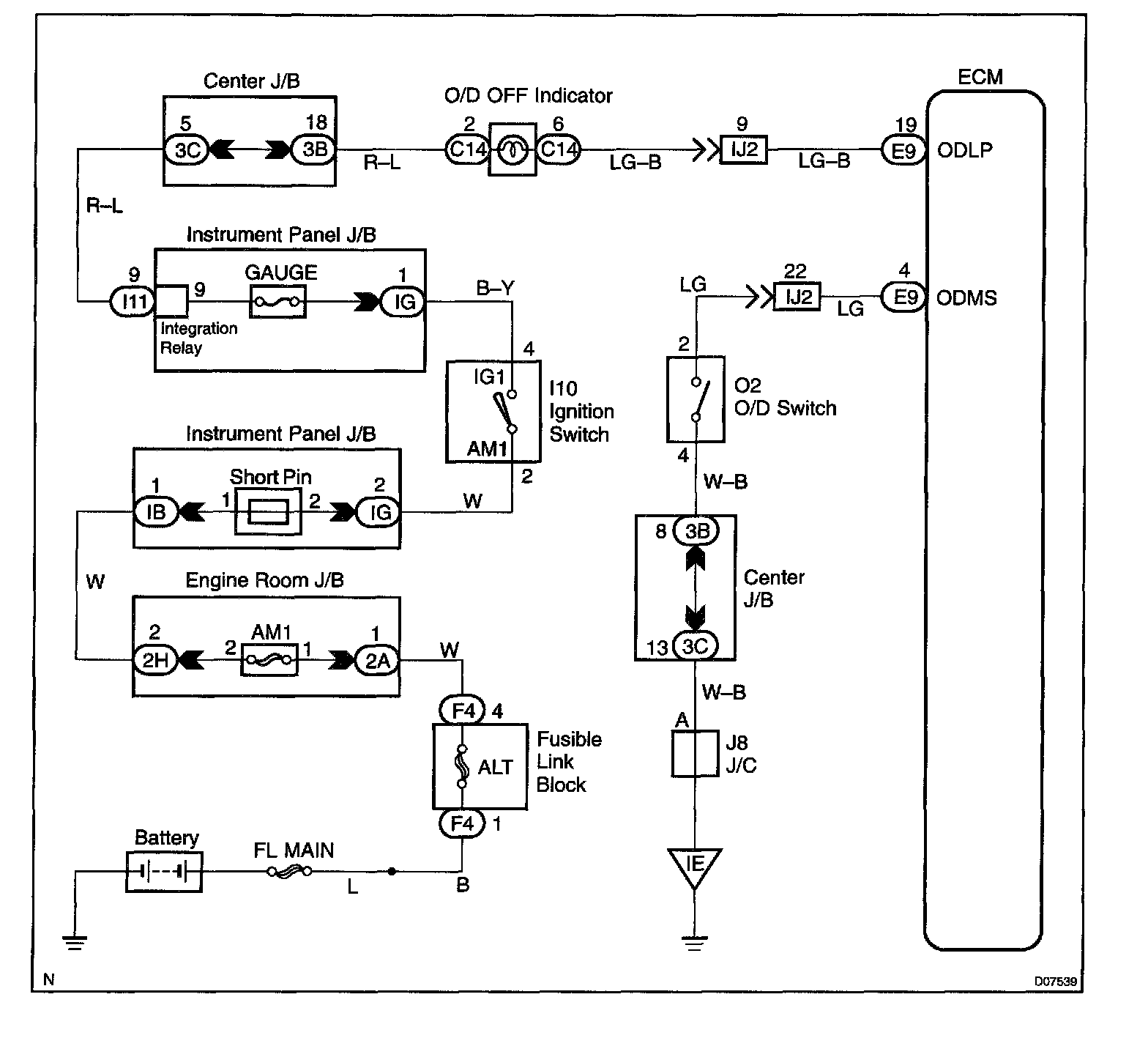 CIRCUIT DESCRIPTIONThe O/D main switch is a momentary type switch. When pressing the O/D main switch, the O/D OFF indicator light lights up and ECM prohibits shifting to O/D, and when pressing it again, the O/D OFF indicator light goes off and ECM allows shifting to O/D. Turning the IG switch OFF will reset the O/D OFF indicator light.