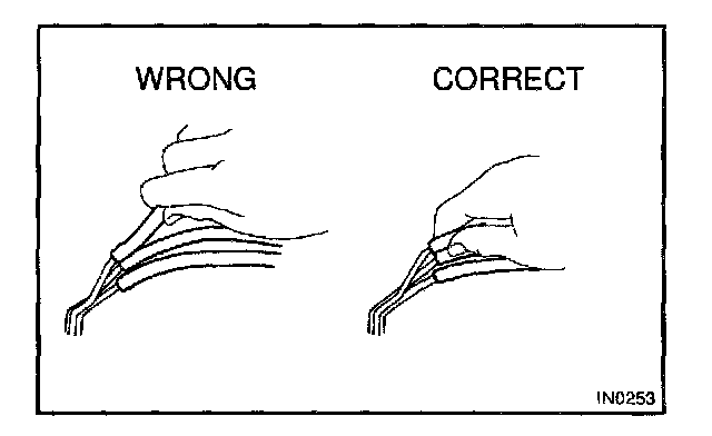 7. When checking continuity at the wire connector, insert the tester probe carefully to prevent terminals from bending