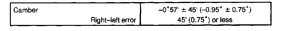 If the measured value is not within the specified value, inspect the suspension parts for damage and/or wear and replace them if necessary because camber is not adjustable.