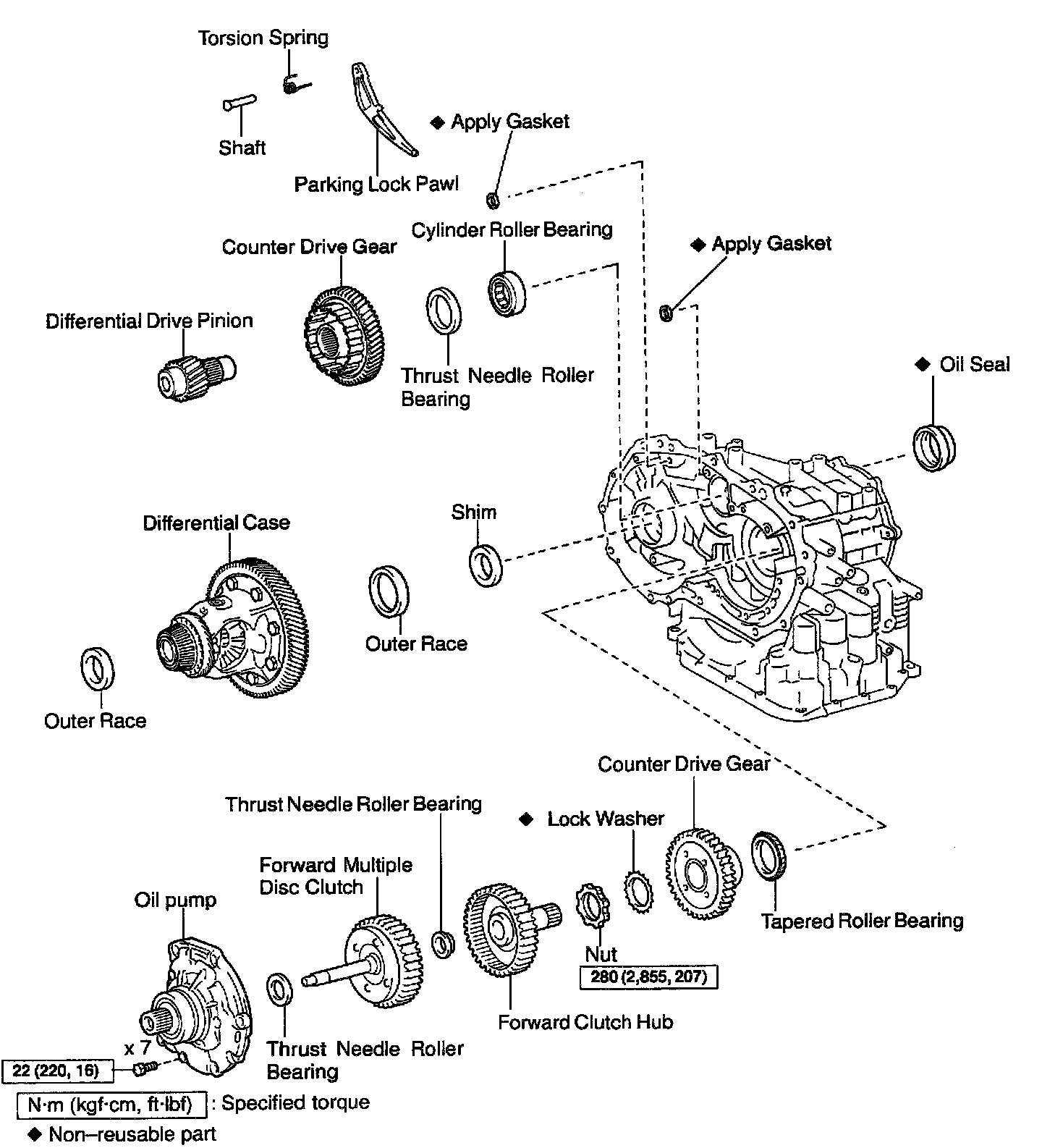 - The automatic transaxle is composed of highly precision-finished parts, necessitating careful inspection before reassembly because even a small nick could cause fluid leakage or affect the performance. The instructions here are organized so that you work on only one component group at a time. This will help avoid confusion from similar-looking parts of different sub-assemblies being on your workbench at the same time. The component groups are inspected and repaired from the converter housing side. As much as possible, complete the inspection, repair and reassembly before proceeding to the next component group. If a defect is found in a certain component group during reassembly, inspect and repair this group immediately. If a component group cannot be assembled because parts are being ordered, be sure to keep all parts of the group in a separate container while proceeding with disassembly, inspection, repair and reassembly of other component groups.