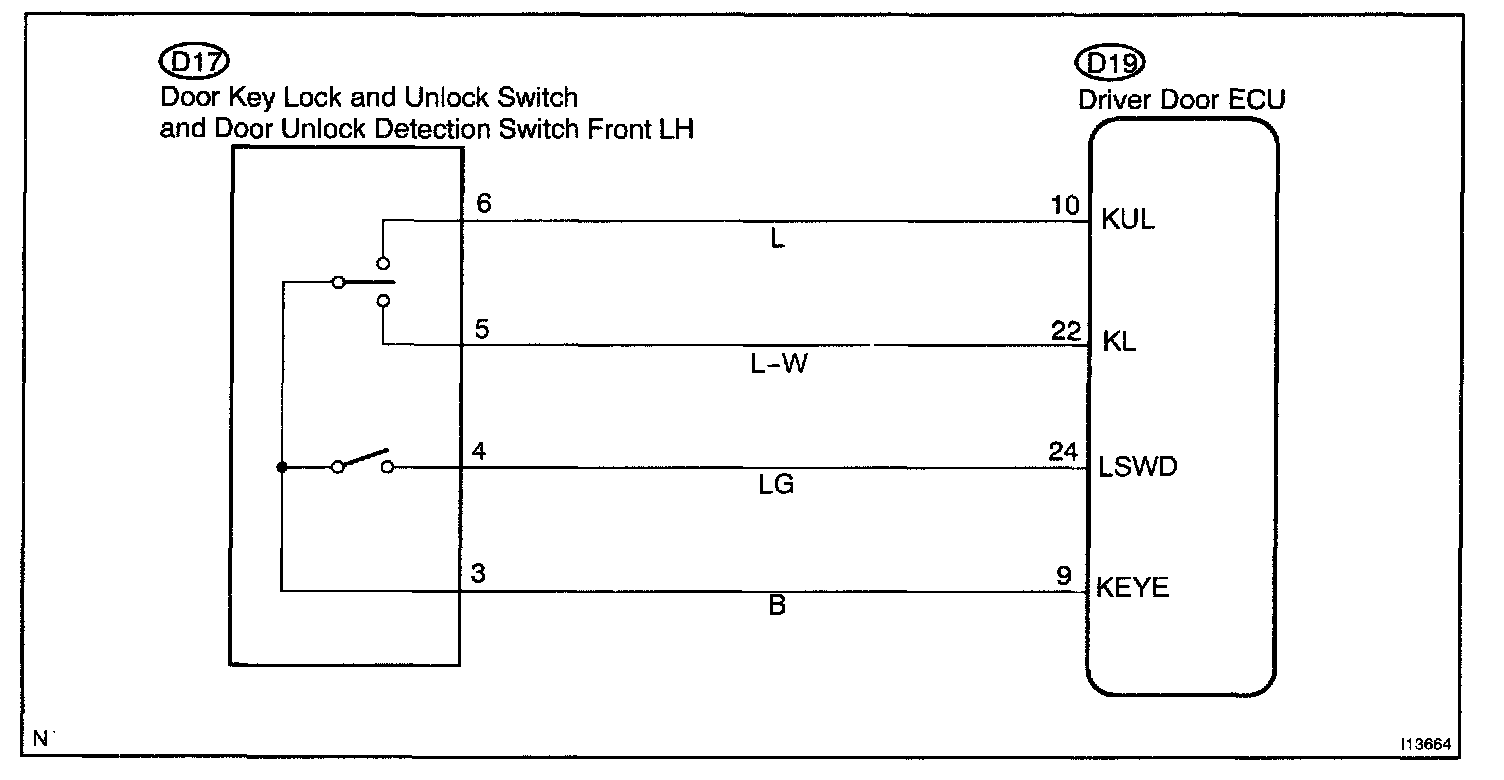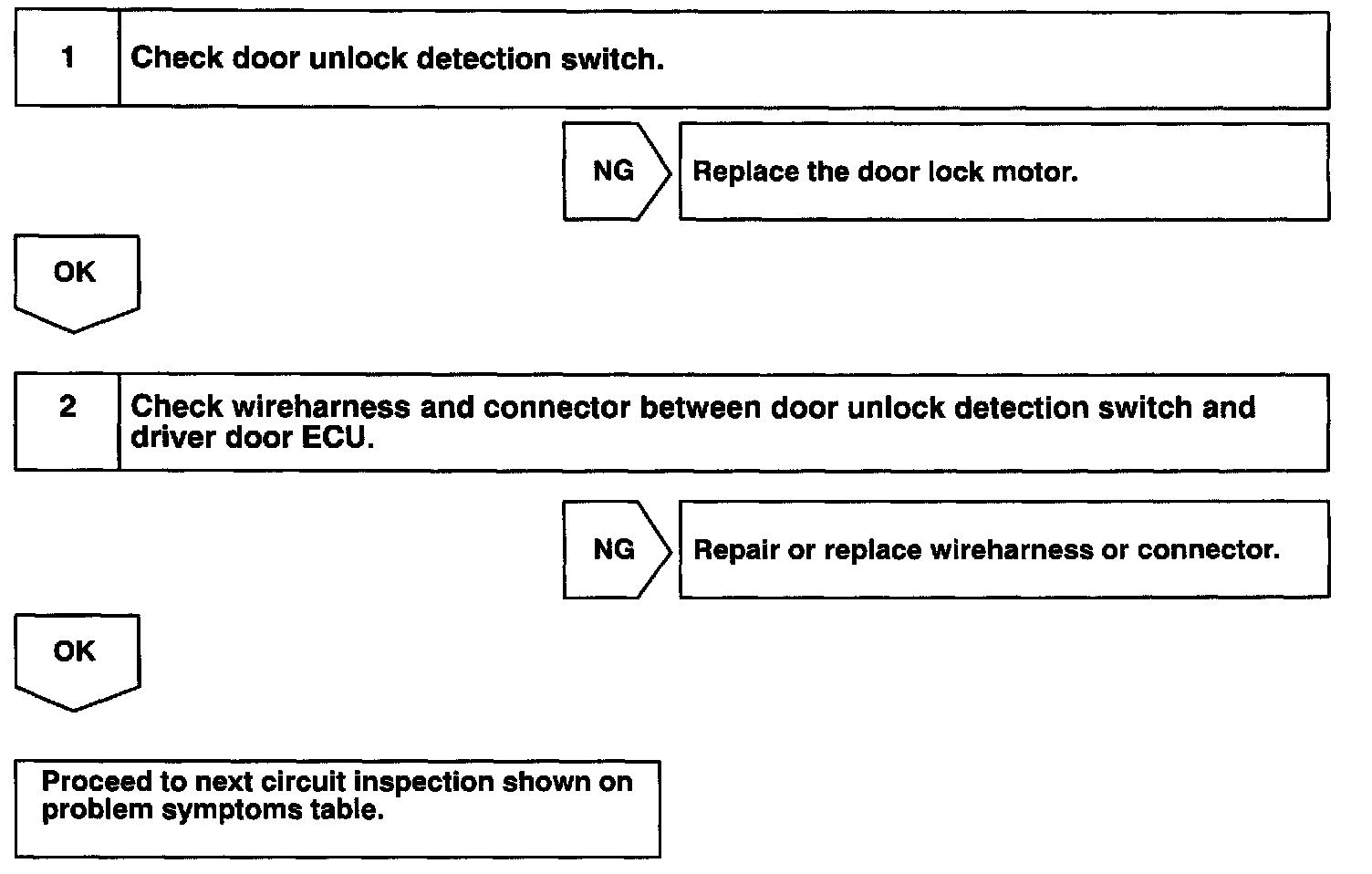 CIRCUIT DESCRIPTIONThe door unlock detection switch is built in the door lock motor assembly. This switch is ON when the door lock knob is in the unlock position and OFF when the lock knob is in the lock position. The ECU detects the door lock knob conditions is this circuit. It is used as one of the operating conditions for the key confinement prevention function.