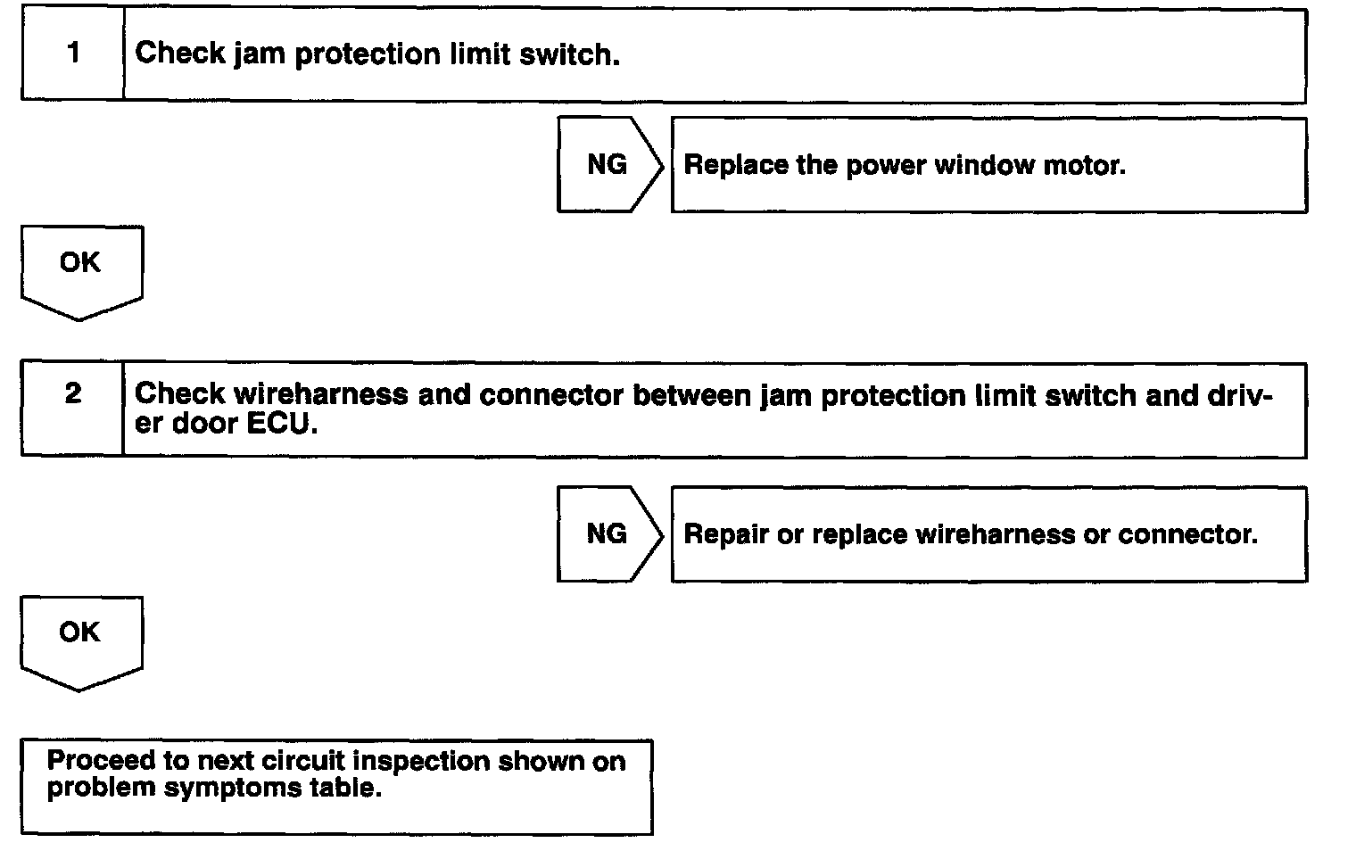 CIRCUIT DESCRIPTIONJam protection limit switch is built-in the power window motor. This switch functions to turn "OFF" before the top dead center, and ECU reads this "OFF" signal resulting in closing the window fully.