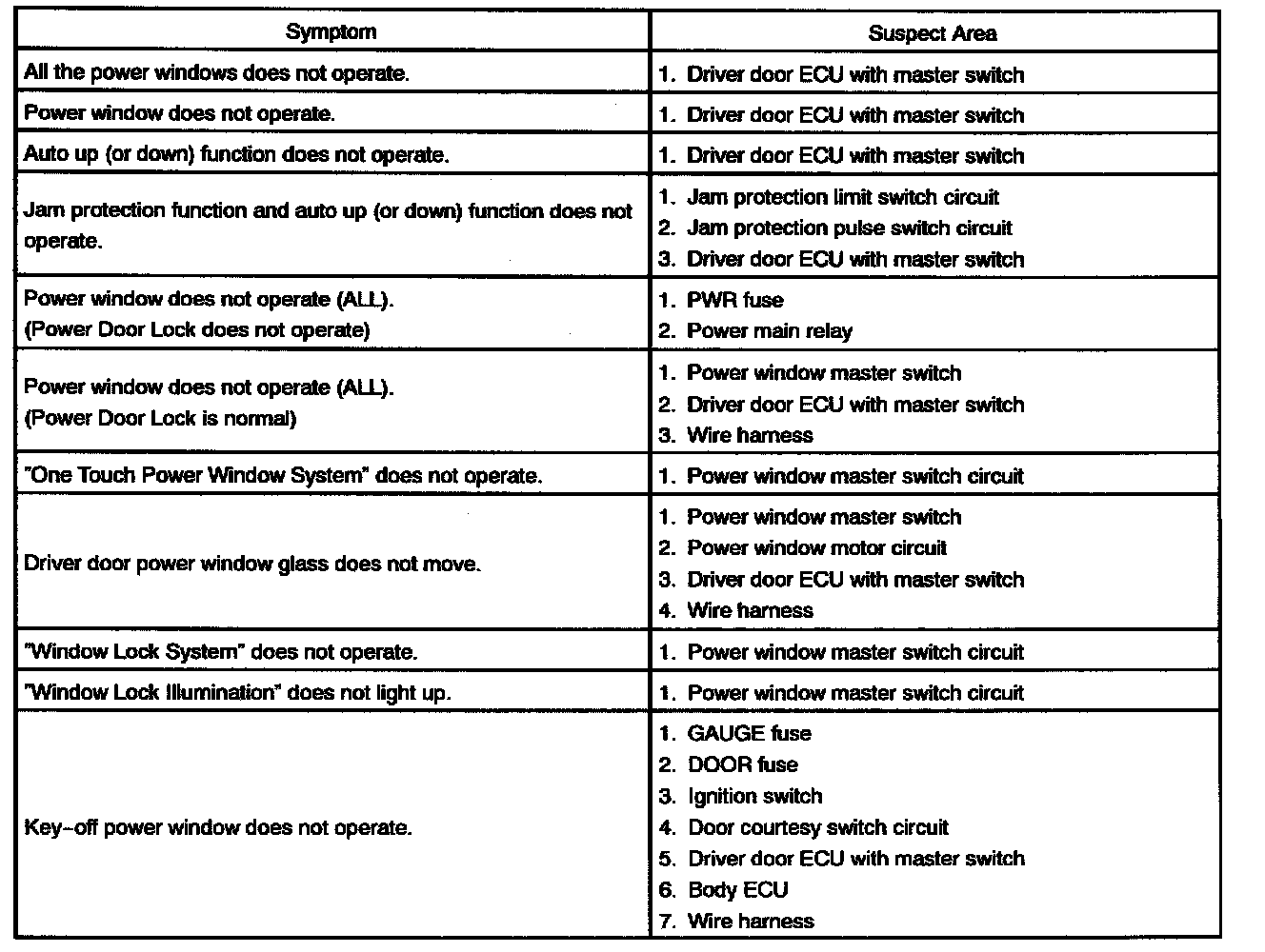 Problem Symptoms Table - Power Window Control System:
