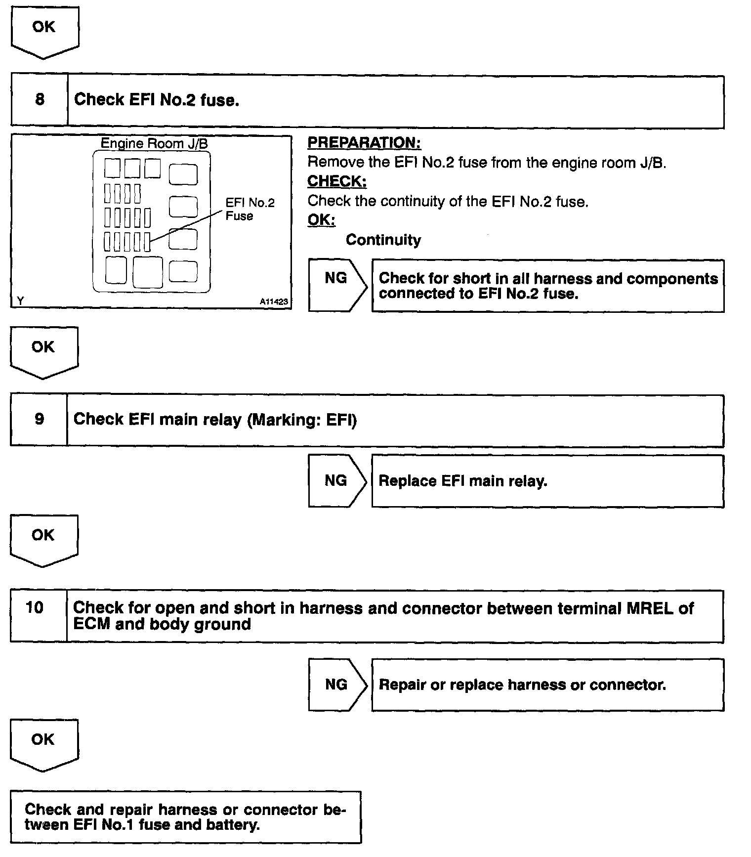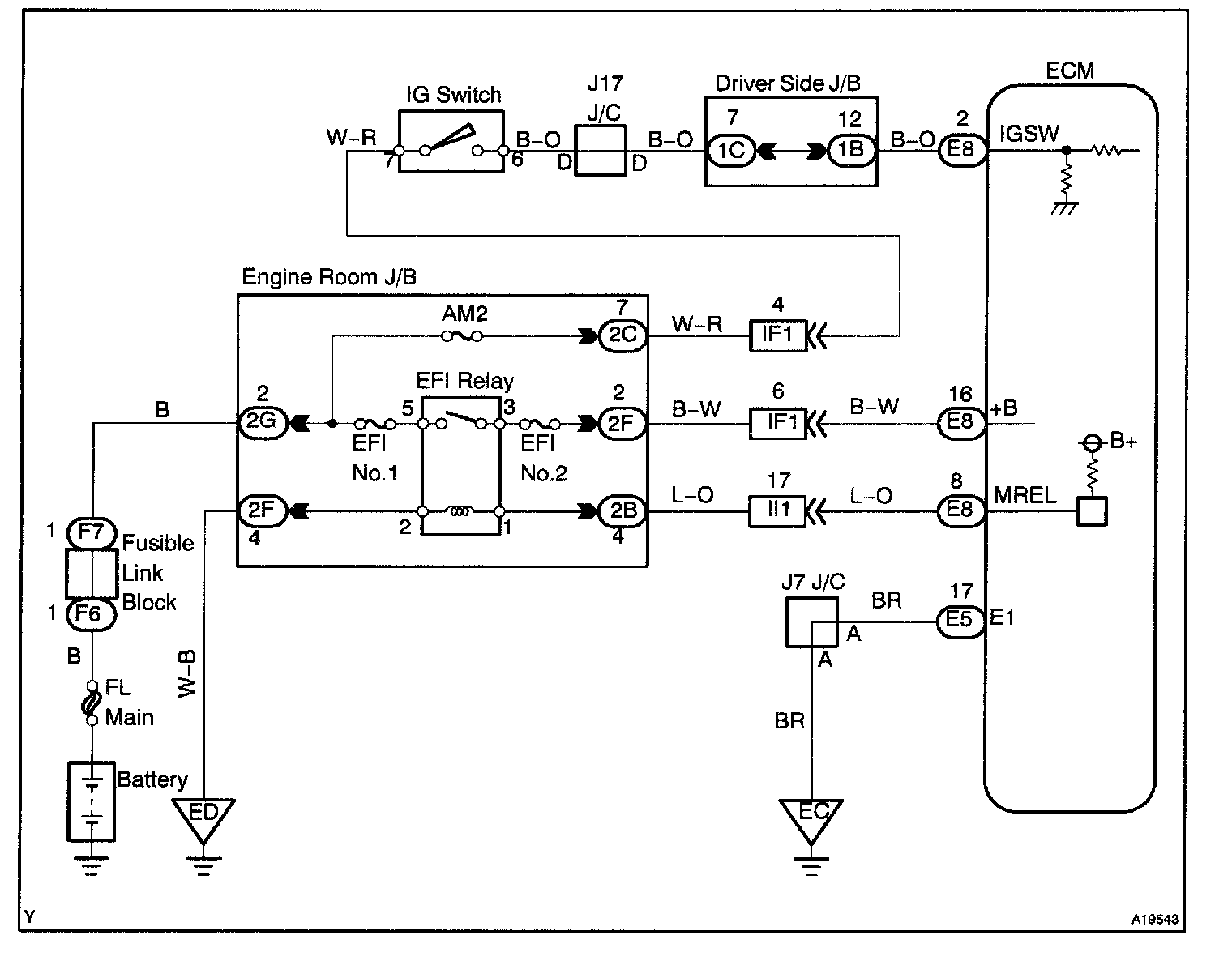 When the ignition switch is turned ON, battery positive voltage is applied to terminal IGSW of the ECM and the EFI main relay (Marking: EFI) control circuit in the ECM sends a signal to terminal MREL of the ECM switching on the EFI main relay.