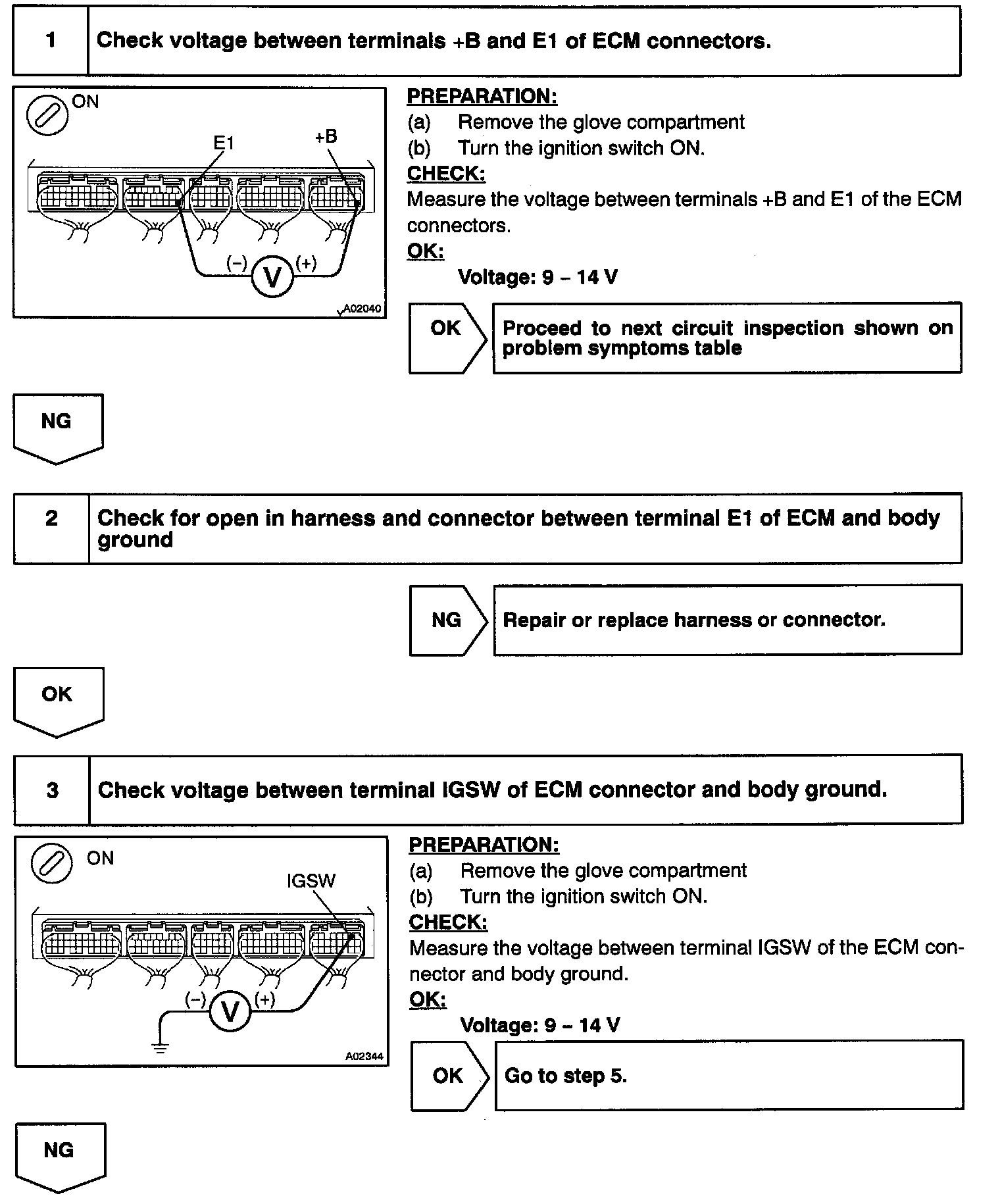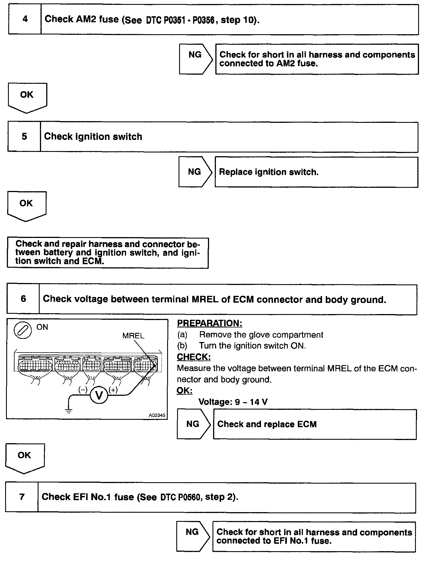This signal causes current to flow to the coil, closing the contacts of the EFI main relay and supplying power to terminal +B of the ECM.
