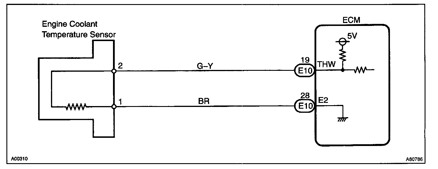 A thermistor built into the engine coolant temperature. sensor changes the resistance value according to the engine coolant temperature.