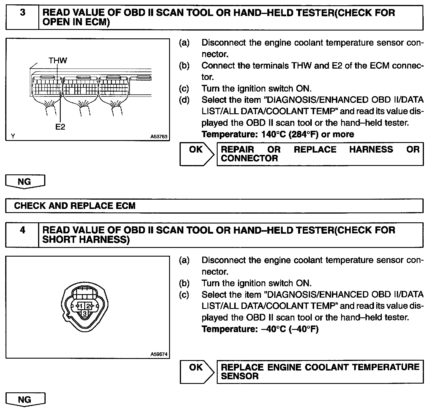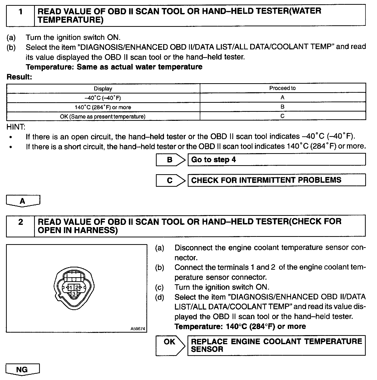 HINT: After confirming DTC P0115, P0117 or P0118, use the OBD II scan tool or the hand-held tester to confirm the engine coolant temperature from the DIAGNOSIS/ENHANCED OBD II/DATA LIST/ALL DATA.