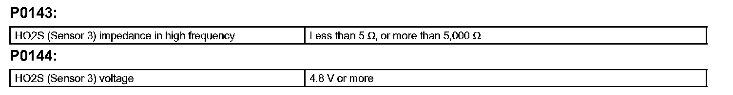 - P0143 indicates an open or short circuit in the heated oxygen sensor 3 system. (1 driving-cycle). The ECM determines this by sensing that the impedance of the sensor exceeds the threshold, i.e. less than 5 Ohms or more than 5,000 Ohms.