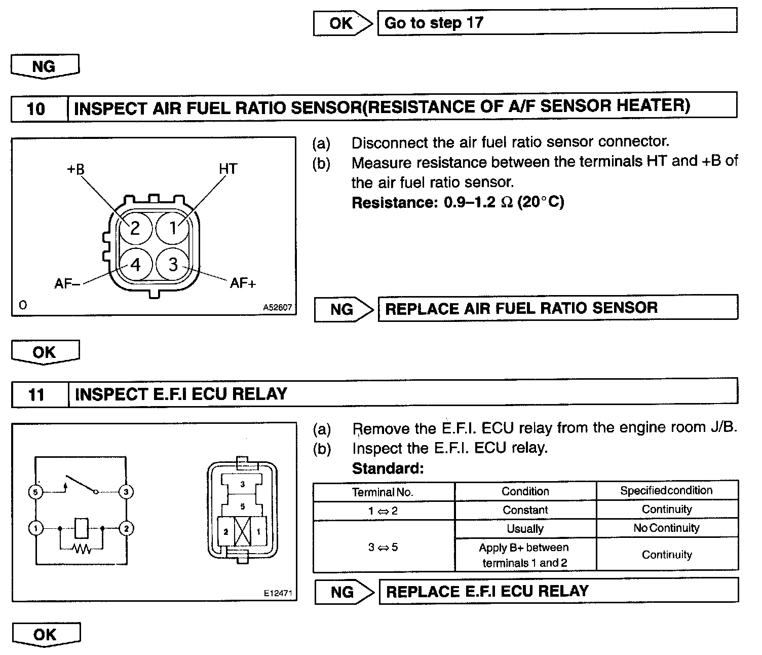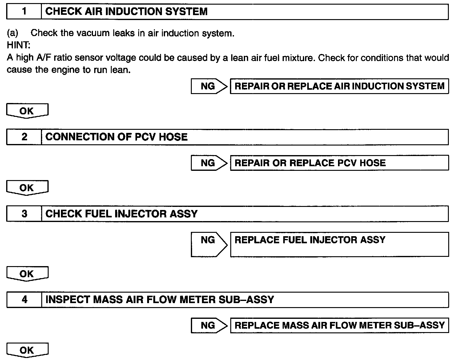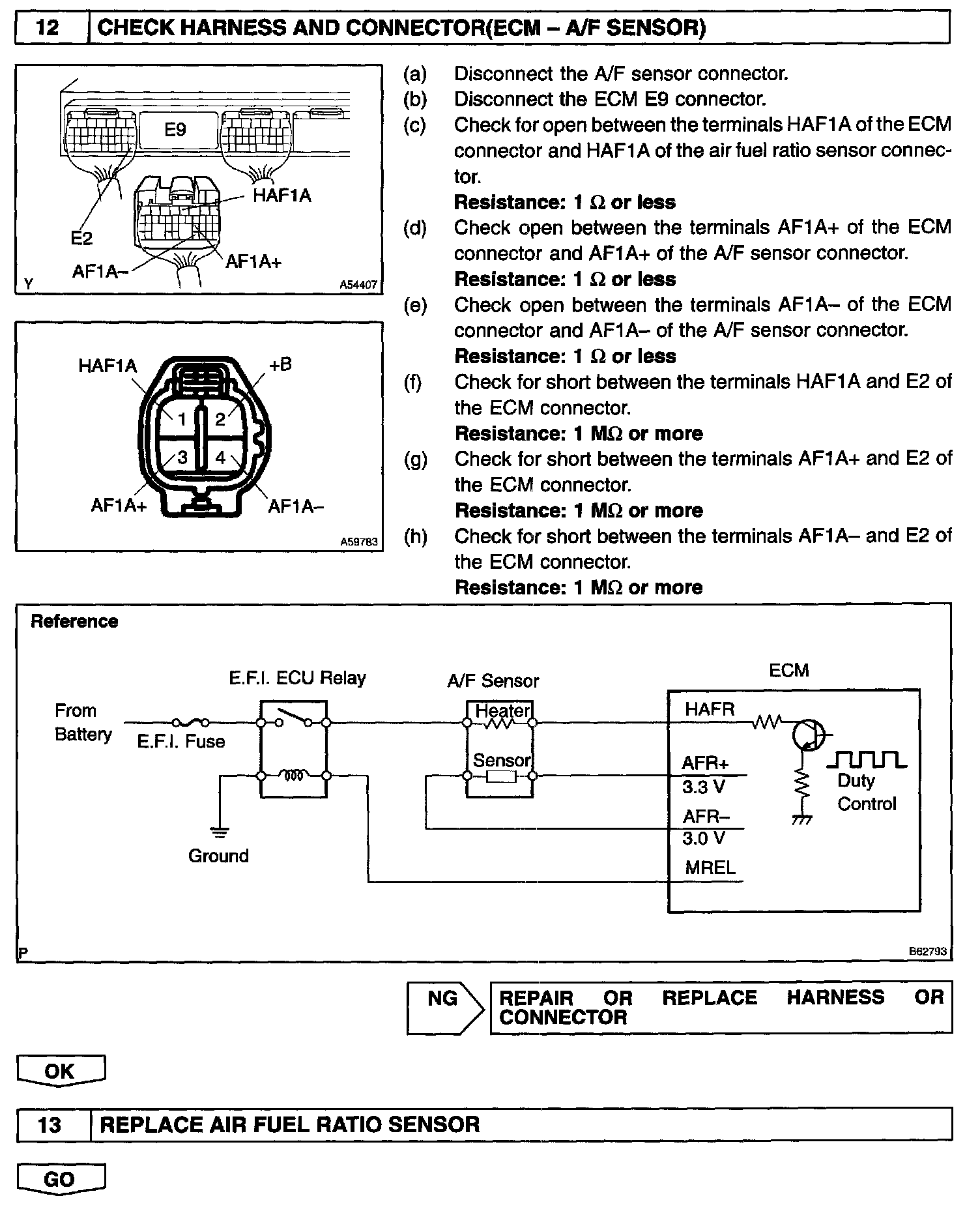 - The ECM controls the voltage of terminals AF1A+ and AF1A- of the ECM to the fixed voltage. Therefore it is impossible to confirm the A/F sensor output voltage without the hand-held tester or the OBD II scan tool.