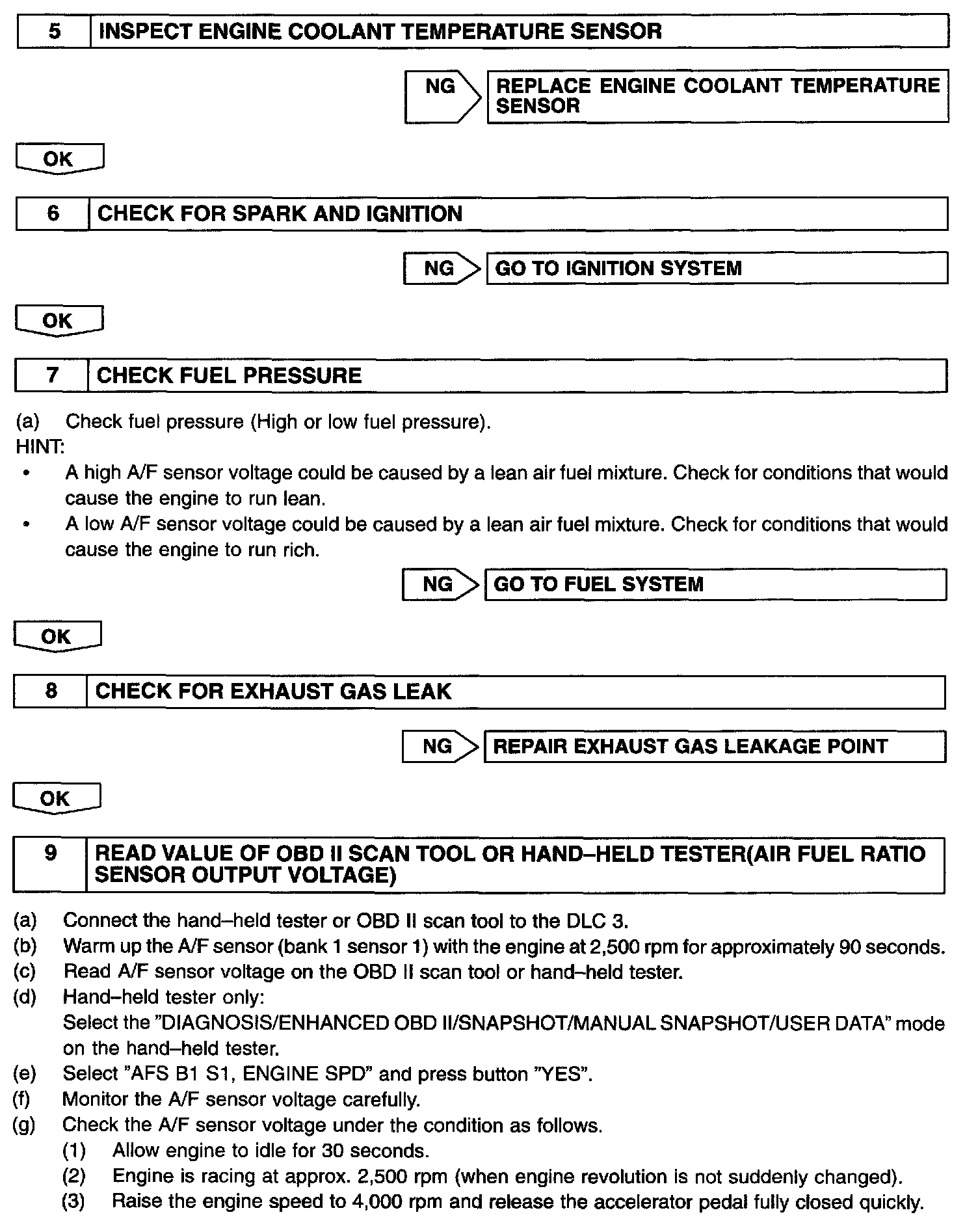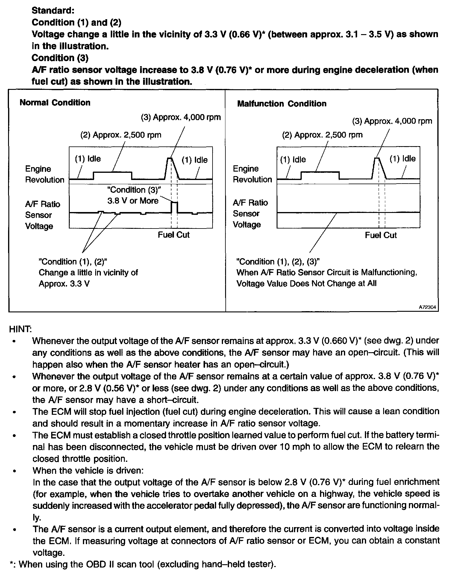 - OBD II scan tool (excluding hand-held tester) displays the one fifth of the A/F sensor output voltage which is displayed on the hand-held tester.