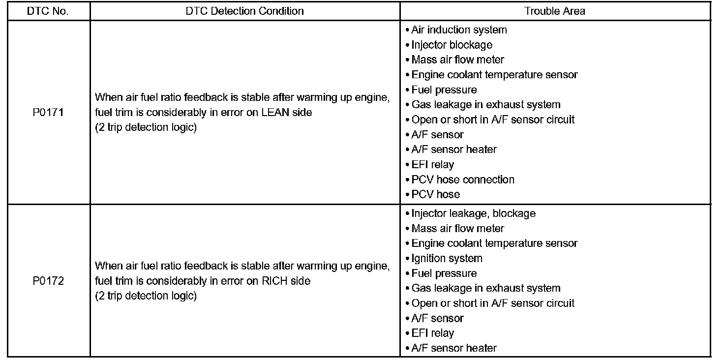 - When the DTC "P0171" is recorded, the actual air-fuel ratio is on the LEAN side. When DTC "P0172" is recorded, the actual air-fuel ratio is on the RICH side.