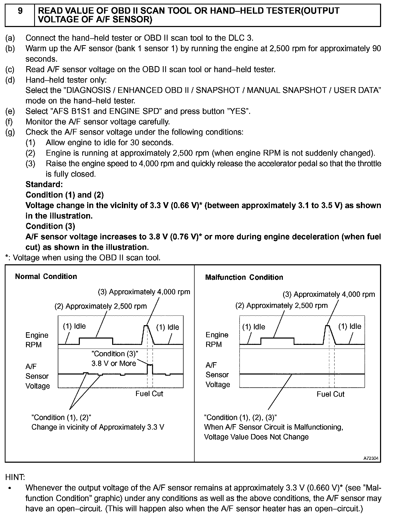 - OBD II scan tool (excluding hand-held tester) displays the one fifth of the A/F sensor output voltage which is displayed on the hand-held tester.
