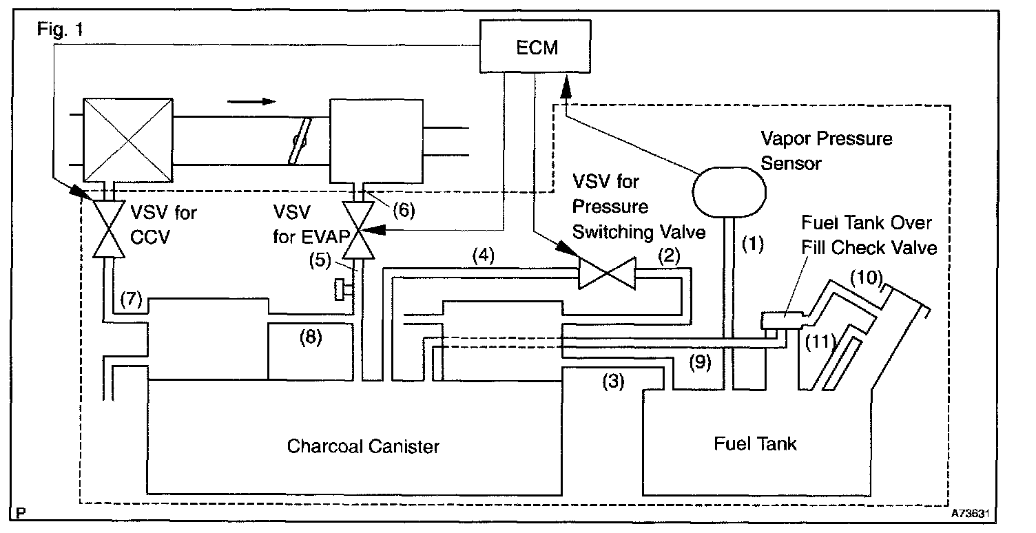 DTC P0442 or P0456 is recorded by the ECM when evaporative emissions leak from the components within the dotted line in Fig. 1, or when the vapor pressure sensor malfunctions.