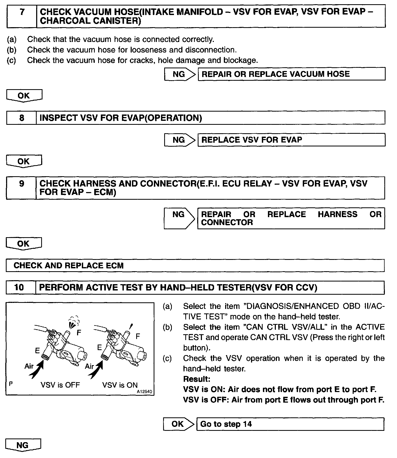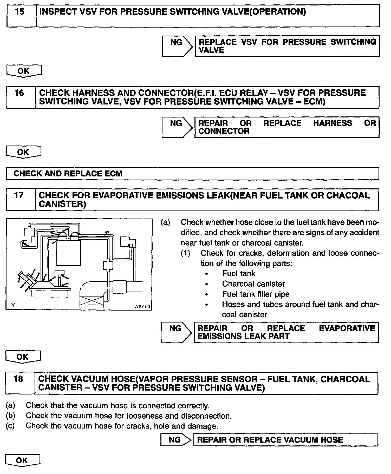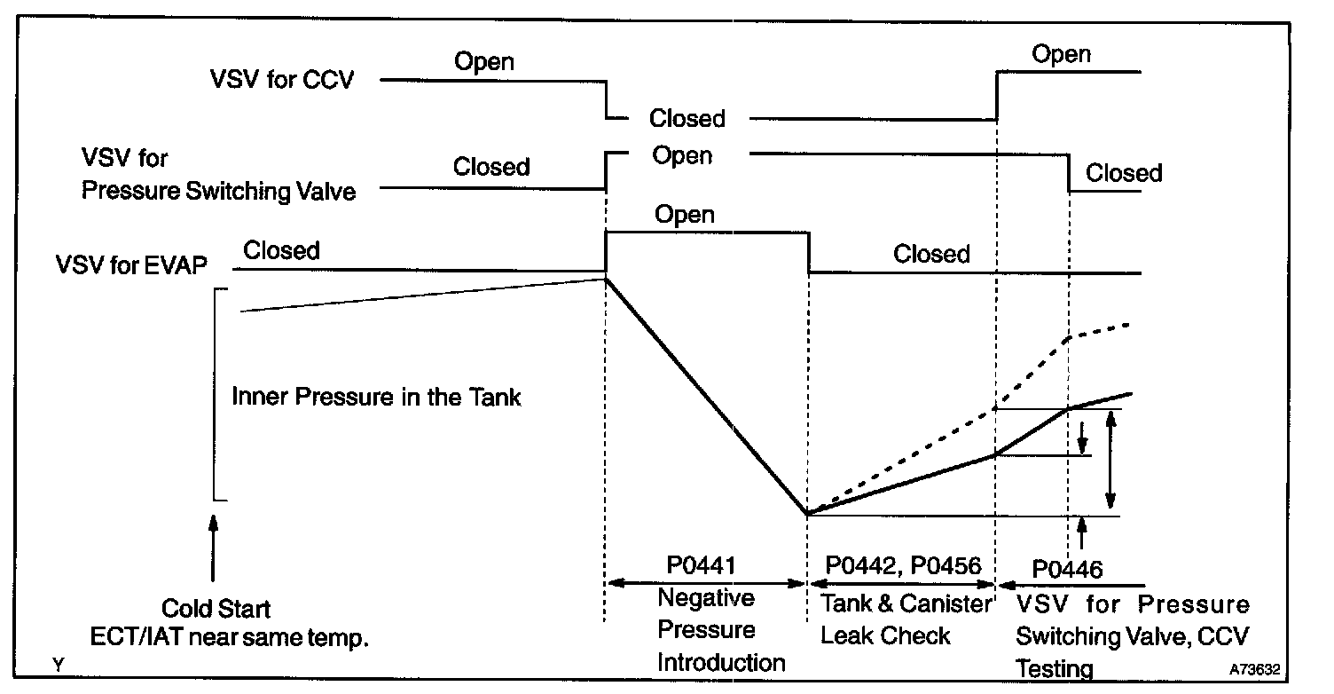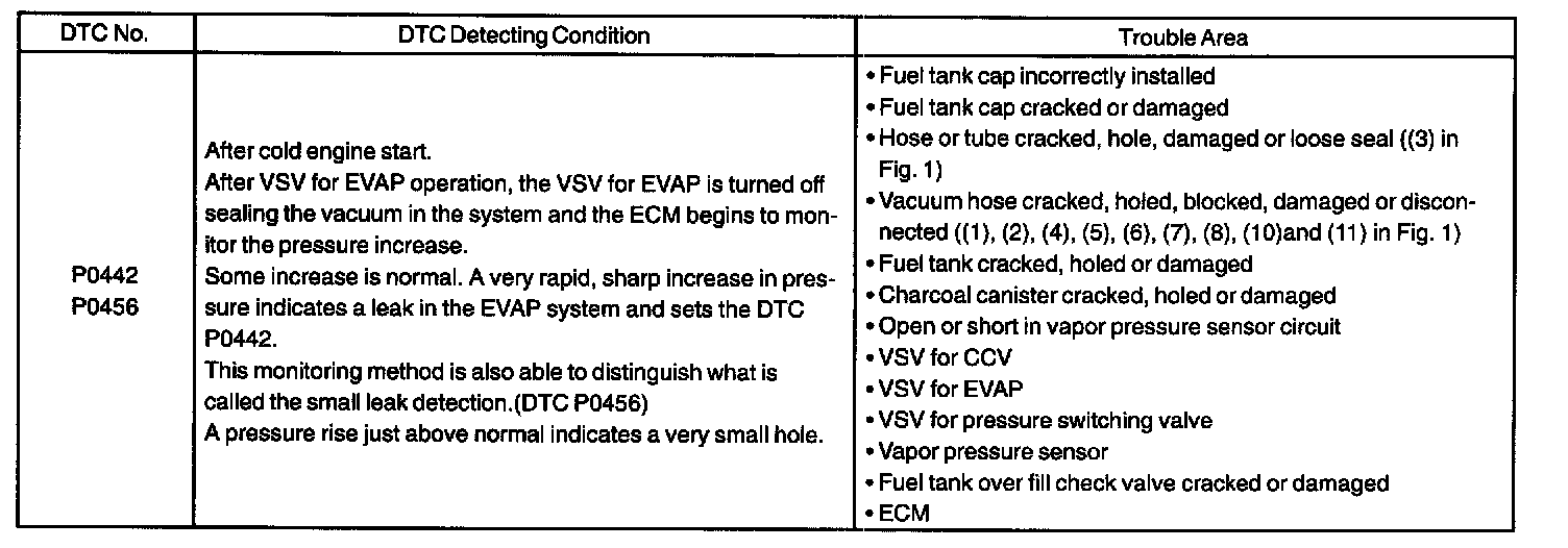 After purge operation, the VSV for EVAP is turned off sealing the vacuum in the system and the ECM begins to monitor the pressure increase. It is a normal if the increase in pressure is lower than the predict level. A very rapid, sharp increase in pressure indicates a leak in the EVAP system and sets the DTC P0442. A pressure rise just above normal indicates a very small hole and will set the DTC P0456.