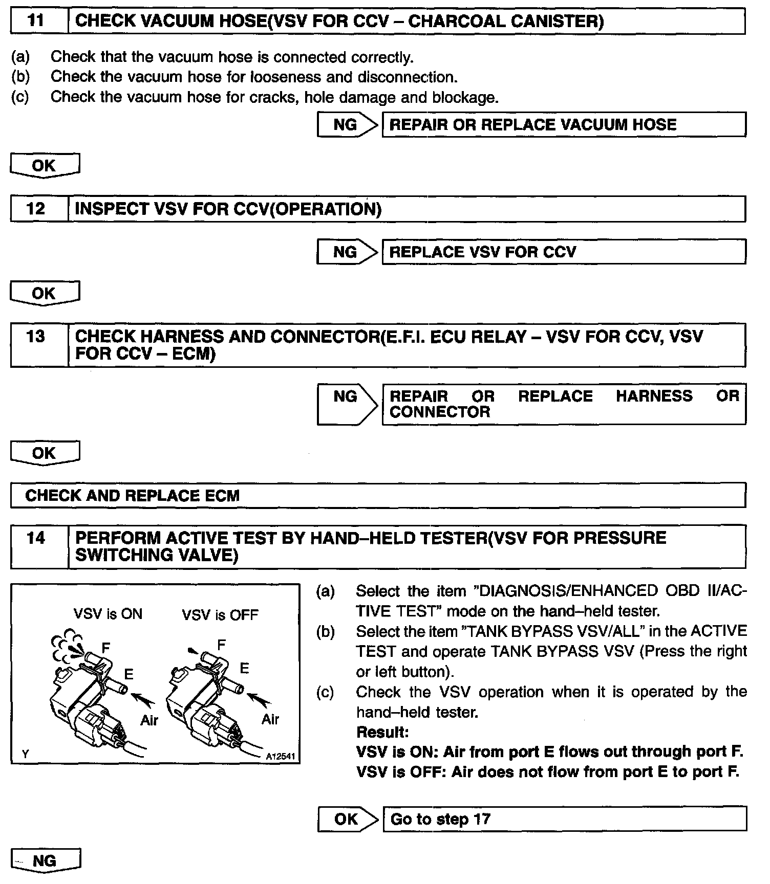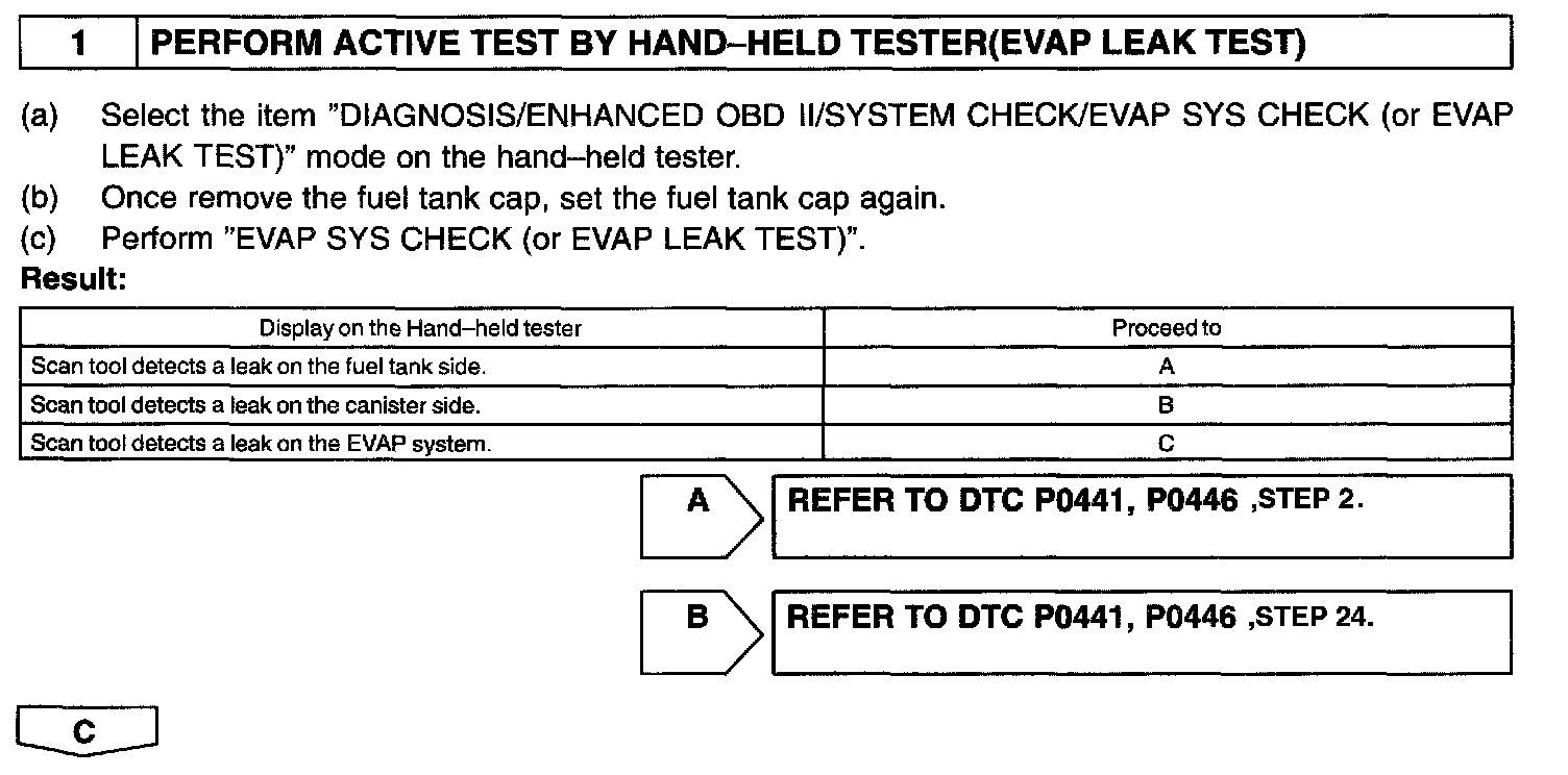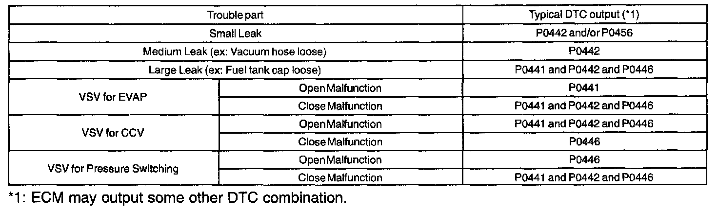 - If DTC P0441 (Purge Flow), P0446 (VSV for CCV or VSV for Pressure switching valve) P0451, P0452 or P0453 (Evaporative Pressure Sensor) is output with DTC P0442 or P0456, first troubleshoot DTC P0441, P0446, P0451, P0452 or P0453. If no malfunction is detected, troubleshoot DTC P0442 or P0456 next.