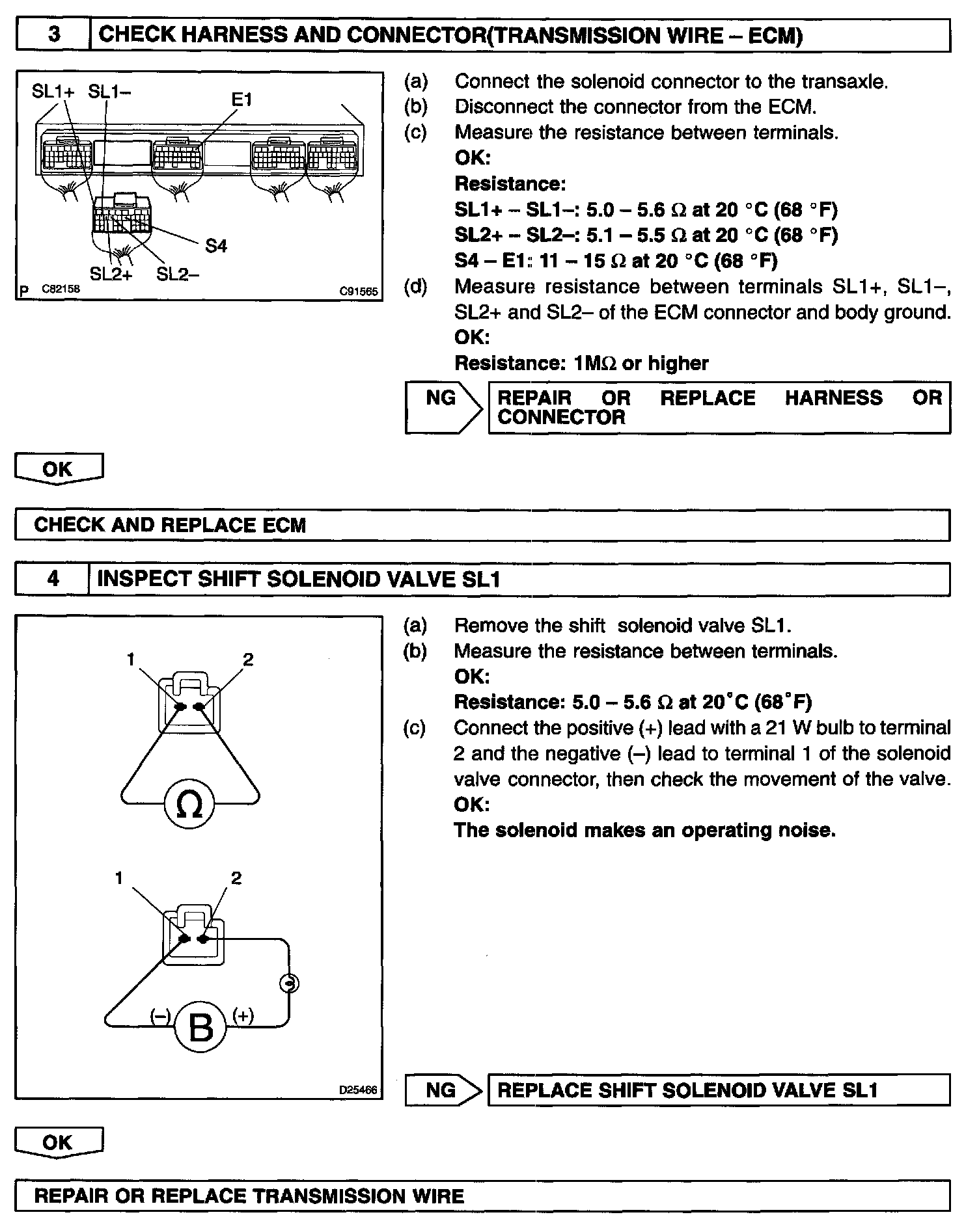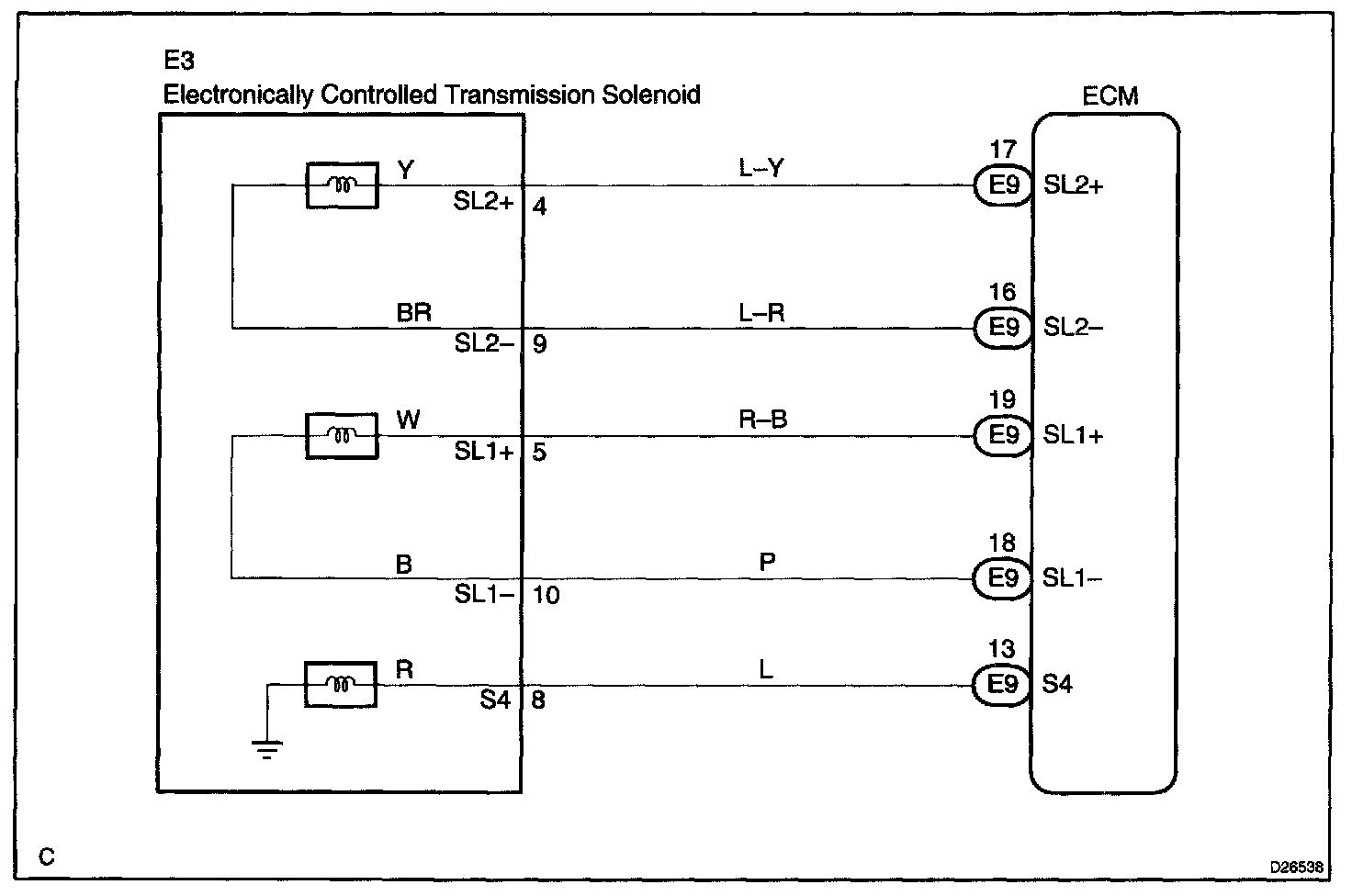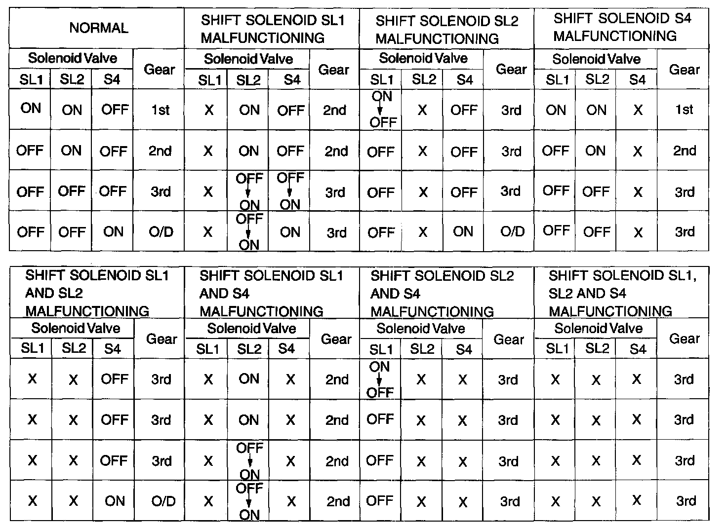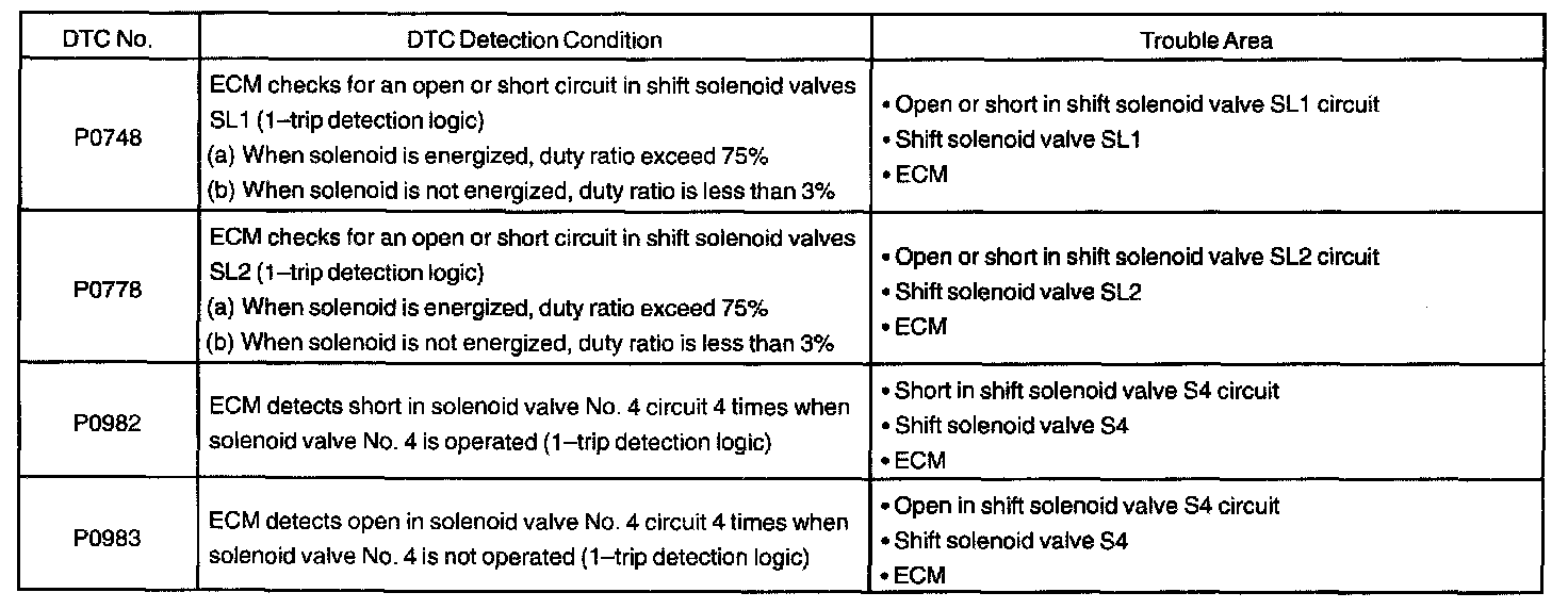 If either of the shift solenoid valve circuits develops an open or short, the ECM turns the other shift solenoid ON and OFF in order to shift into the gear positions shown in the table. The ECM also turns the shift solenoid valve SL OFF at the same time. If both solenoids malfunction, hydraulic control cannot be performed electronically, and so it must be done manually.