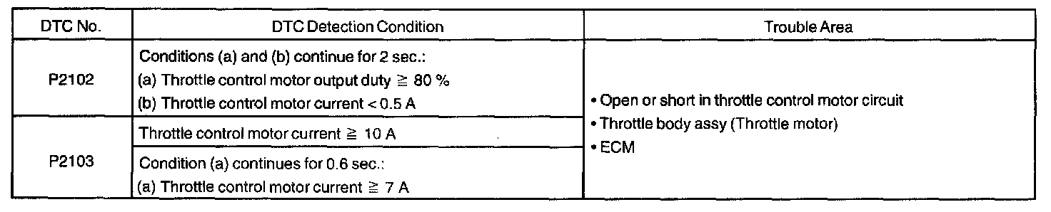If this DTC is stored, the throttle valve is locked at a certain opening angle. Also, the whole electronically controlled throttle operation is cancelled until the system returns to normal and the ignition switch is turned OFF.