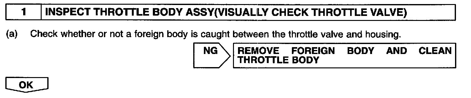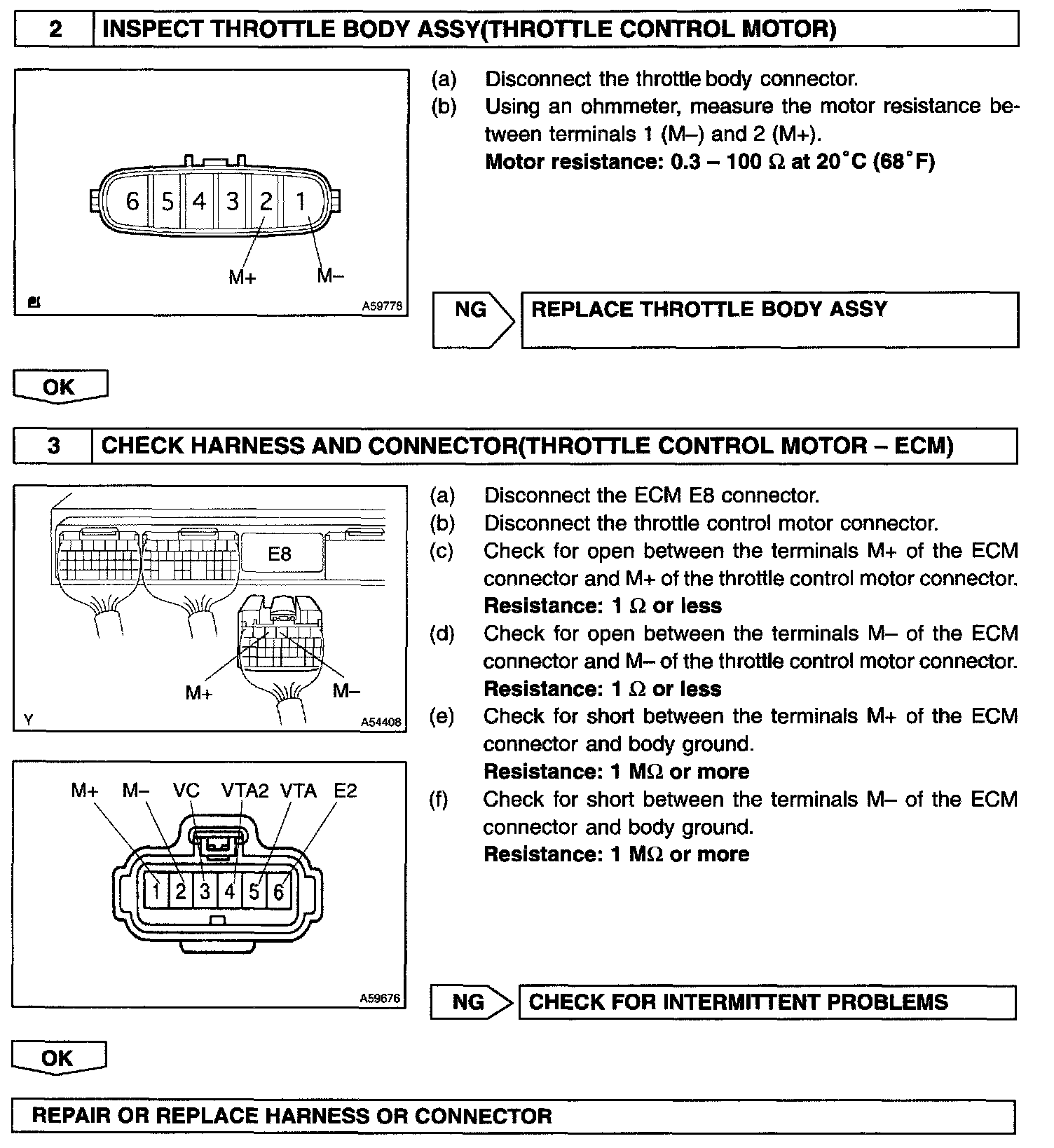 The throttle motor is operated by the ECM and it opens and closes the throttle valve. The opening angle of the throttle valve is detected by the throttle position sensor which is mounted on the throttle body. And, it provides feedback to the ECM to control the throttle motor in order to make the throttle valve opening angle properly in response to the driving condition. If this malfunction is detected, the ECM shuts down the power for the throttle motor, and the throttle valve is fully closed by the return spring. And the throttle valve is locked at a certain opening angle. Also, the whole electronically controlled throttle operation is cancelled until the system returns to normal and the ignition switch is turned OFF.