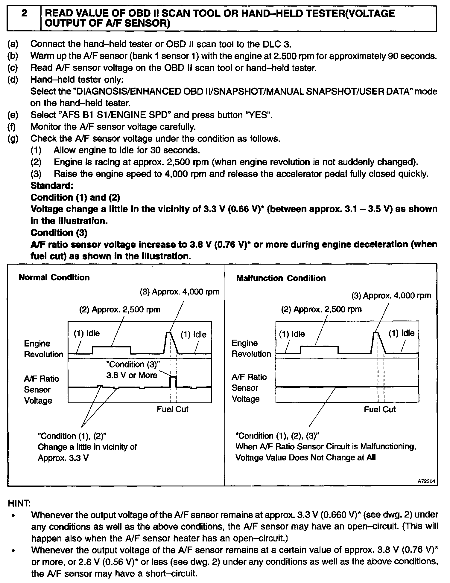 - Read freeze frame data using the hand-held tester or the OBD II scan tool, as freeze frame data records the engine conditions when a malfunction is detected. When troubleshooting, it is useful for determining whether the vehicle was running or stopped, the engine was warmed up or not, the air-fuel ratio was lean or rich, etc. at the time of the malfunction.