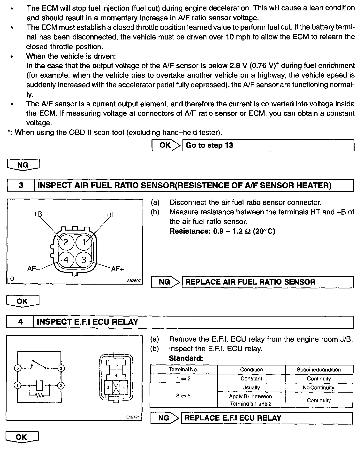 By the A/F sensor output, the ECM can determine the deviation amount from the stoichiometric air-fuel ratio and control the proper injection time immediately. If the A/F sensor is malfunctioning, ECM is unable to perform the accurate air-fuel ratio control.