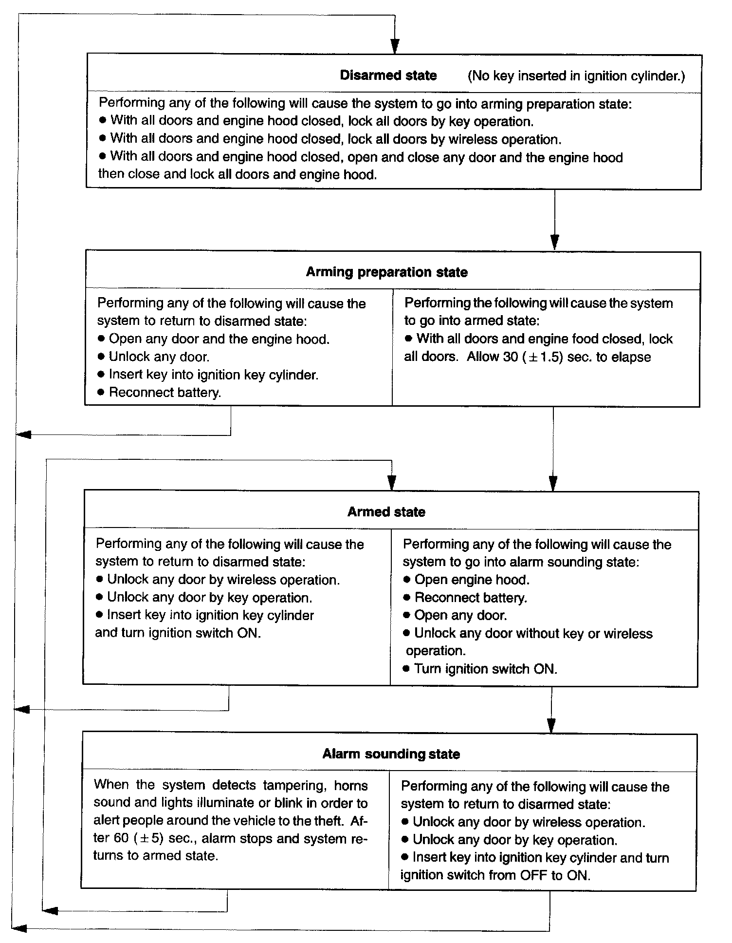 b. The theft deterrent system has 2 modes; one is active arming mode and the other is passive arming mode. Passive arming mode can be switched ON/OFF by the specified method (See step 6).
