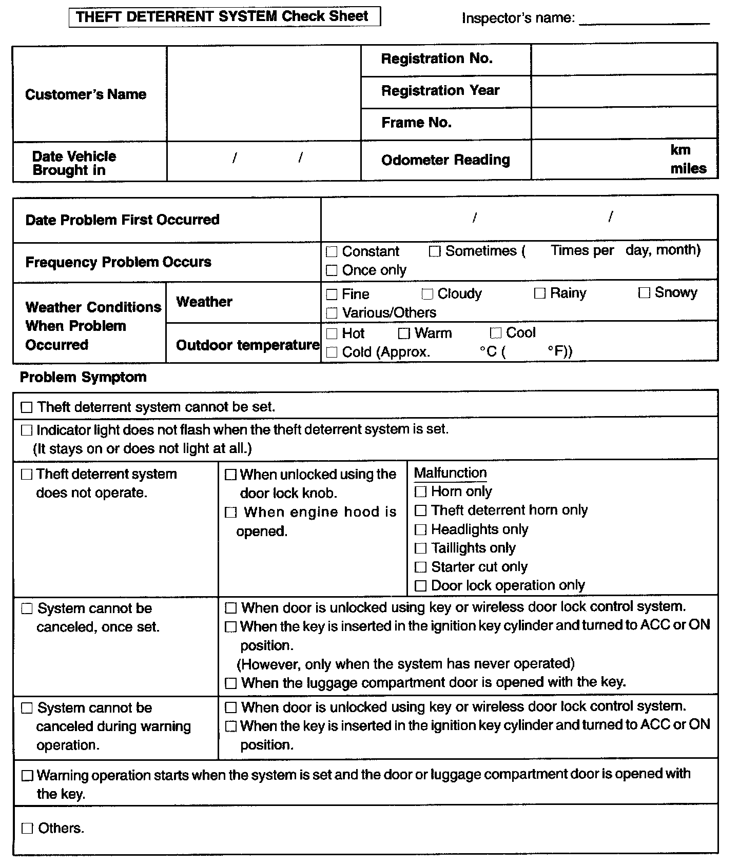 Theft Deterrent System Check Sheet: