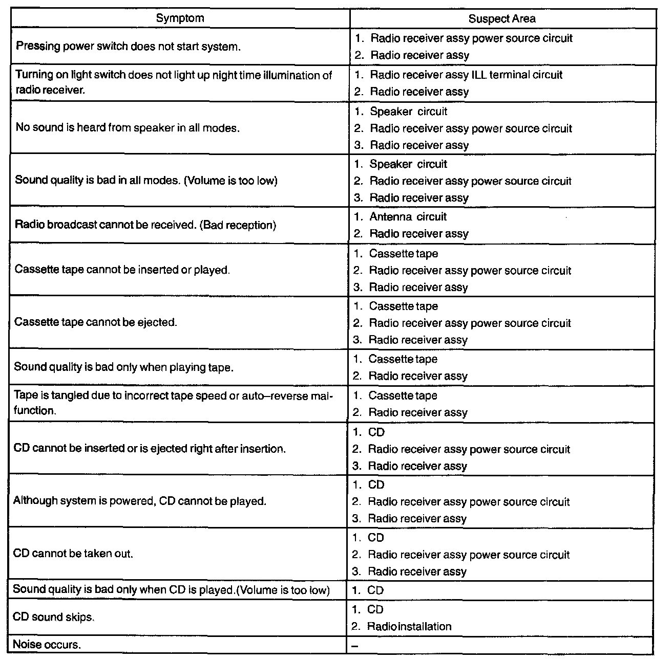 Problem Symptoms Table