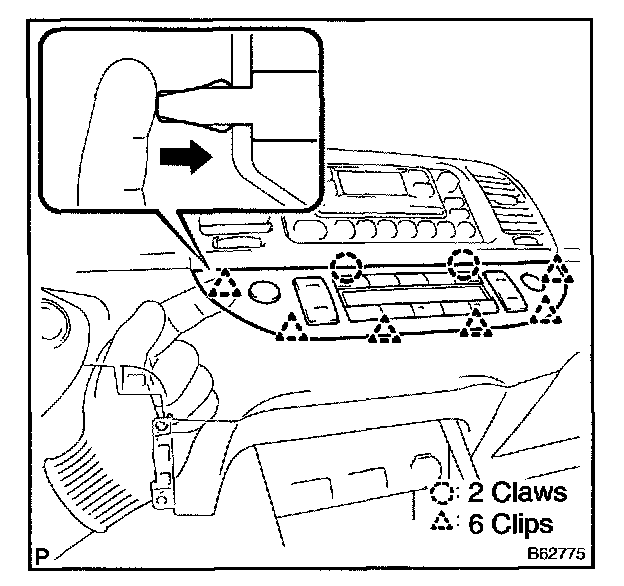 b. Remove the remaining clips and the engagement of claws, and then take off the air conditioner control assembly.