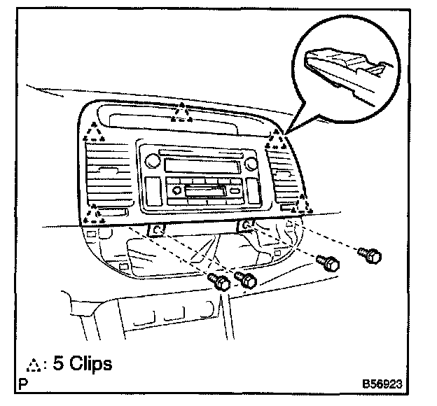 b. Using a moulding remover, disengage 5 clips and remove the instrument cluster finish panel sub-assy center with radio receiver assy, then disconnect the connectors.