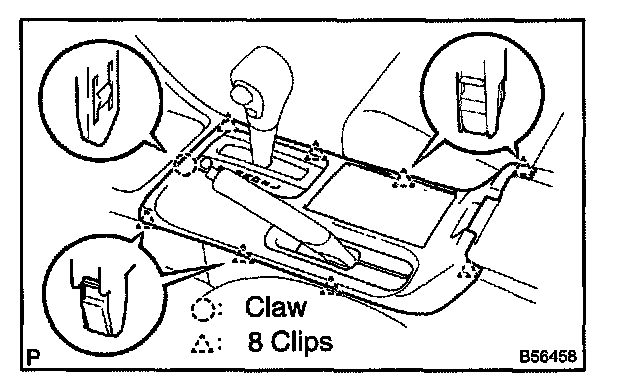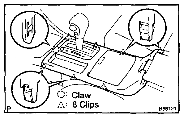 Using a moulding remover, disengage the claw, 8 clips and remove the console panel upper rear.