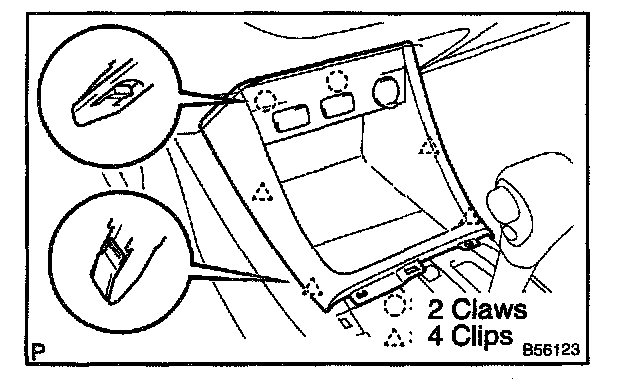 c. Disengage the 4 clips and remove the instrument panel finish panel lower center.