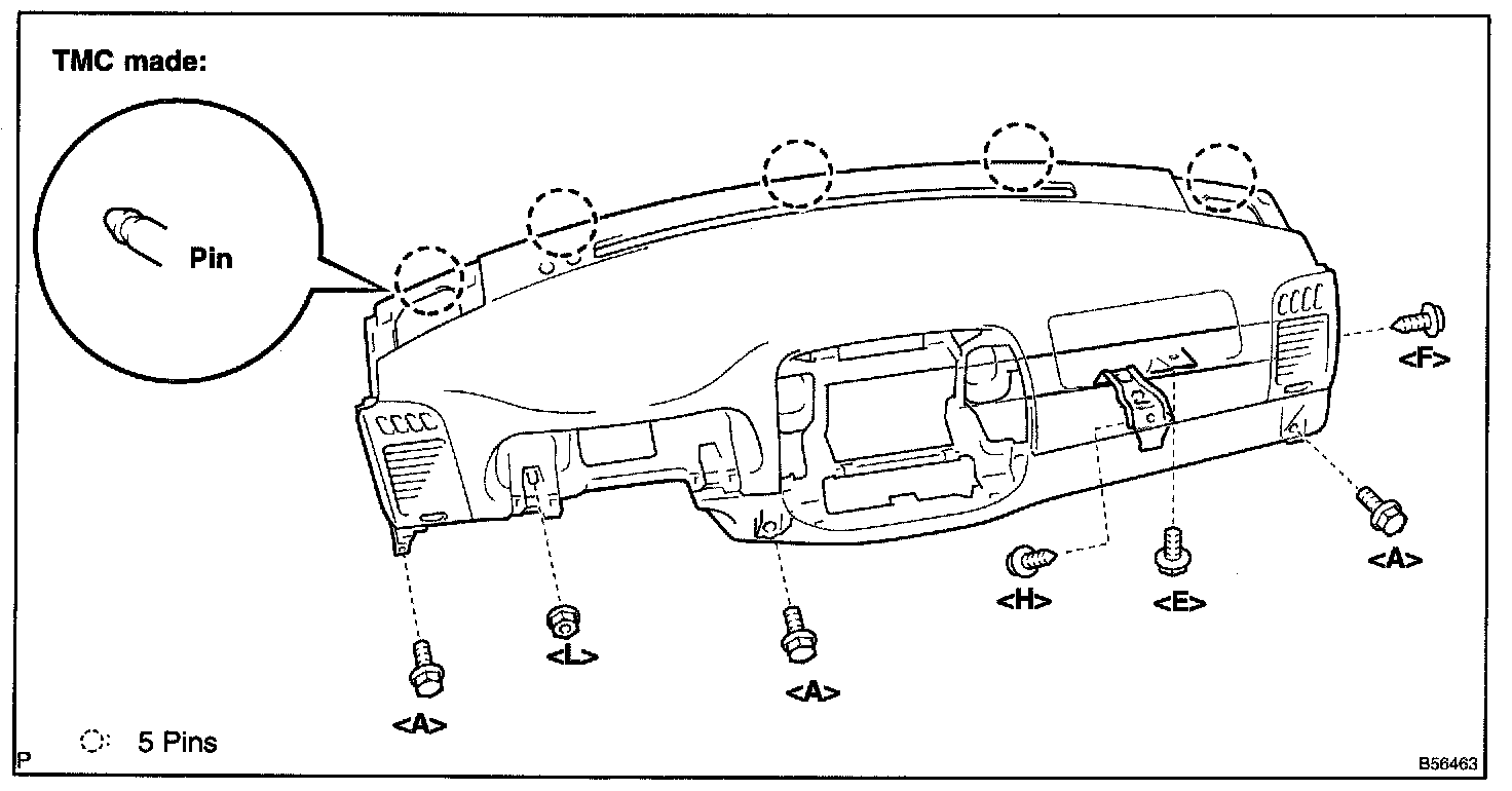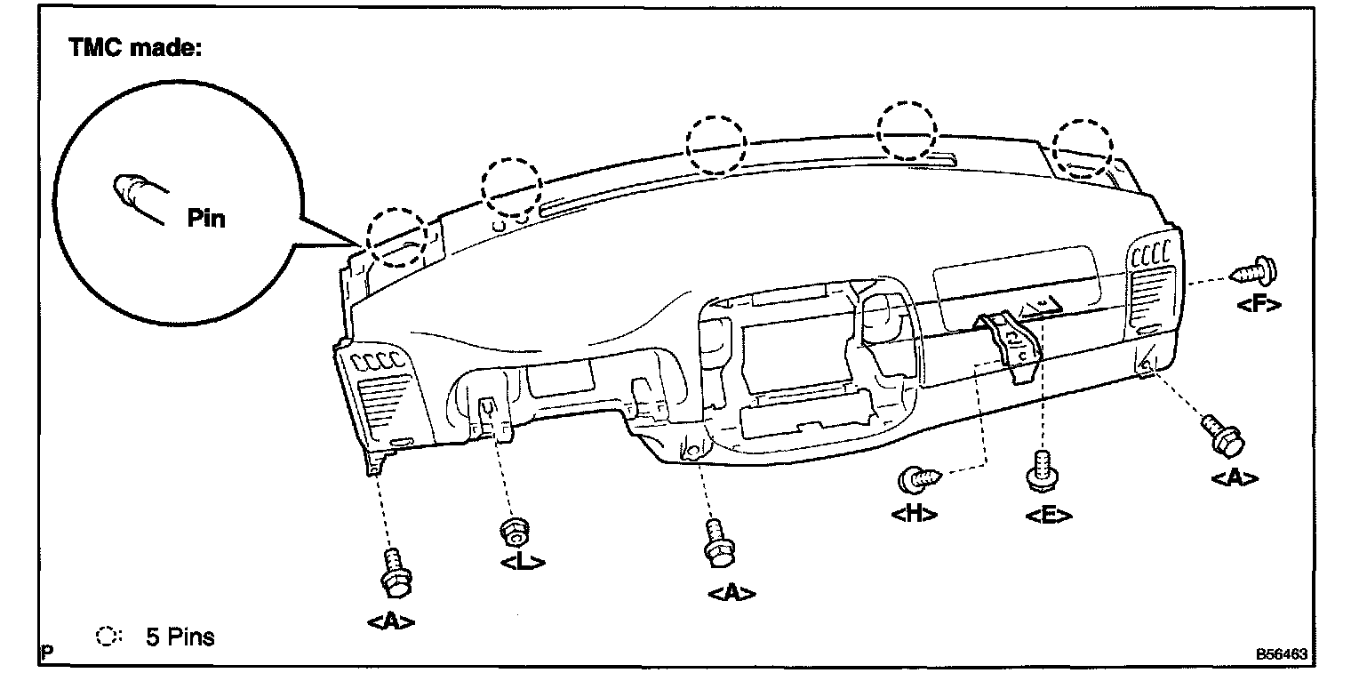 d. Disengage the 5 pins and, remove the instrument panel safety pad sub-assy.