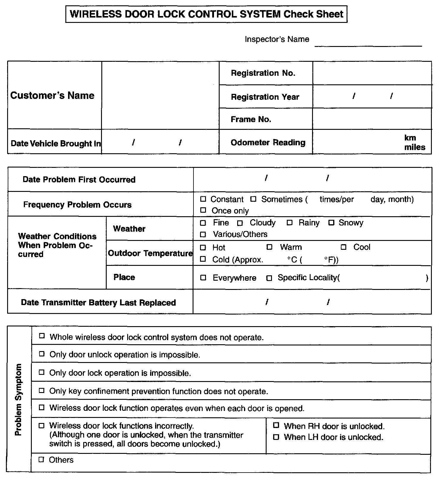 Wireless Door Lock Control System Check Sheet: