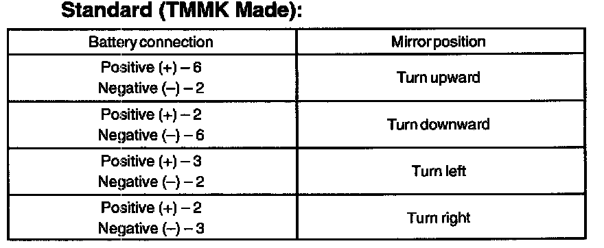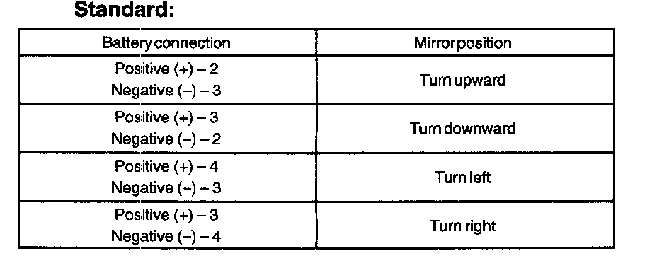 2. Check that the mirror is heated up when connecting the battery positive (+) to terminal 4 and the battery negative (-) to terminal 5 of the connector.