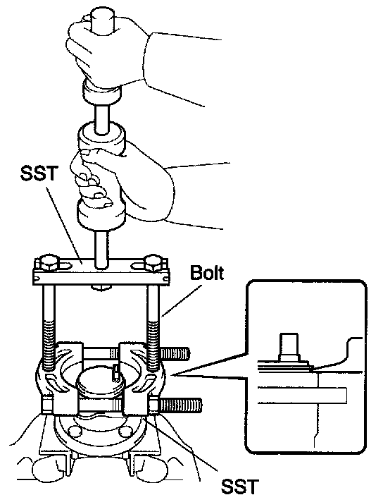 b. Using a pin punch and hammer, drive out the 2 pins and remove the 2 attachments from SST.