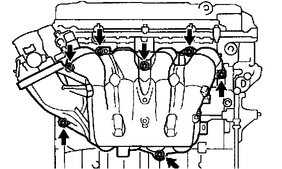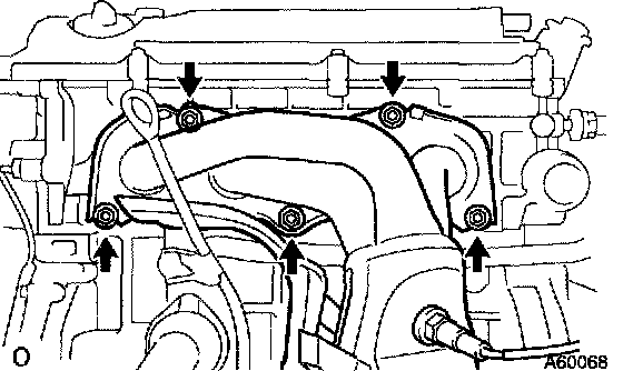 b. Remove the 5 bolts, 2 nuts, intake manifold and gasket.
