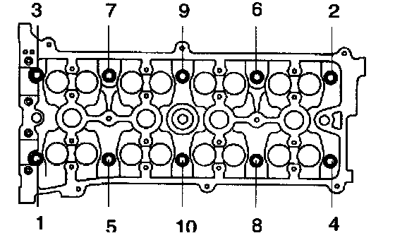 c. Using a 10 mm bi-hexagon wrench, install and uniformly tighten the 10 cylinder head bolts and plate washers, in several passes, in the sequence shown.