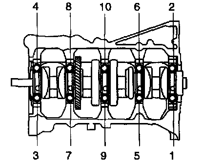 a. Uniformly loosen and remove the 10 bearing cap sub-assembly bolts, in several passes, in the sequence shown.