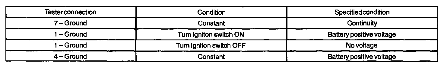 b. Connect the connector to turn signal flasher and inspect the wire harness side connector from the back side as shown in the chart.