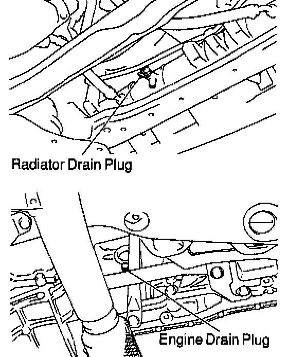 b. Loosen the radiator drain plug (on the right side of the radiator lower tank) and engine drain plug (on the left rear of the cylinder block), and drain the coolant. Close the drain plugs.