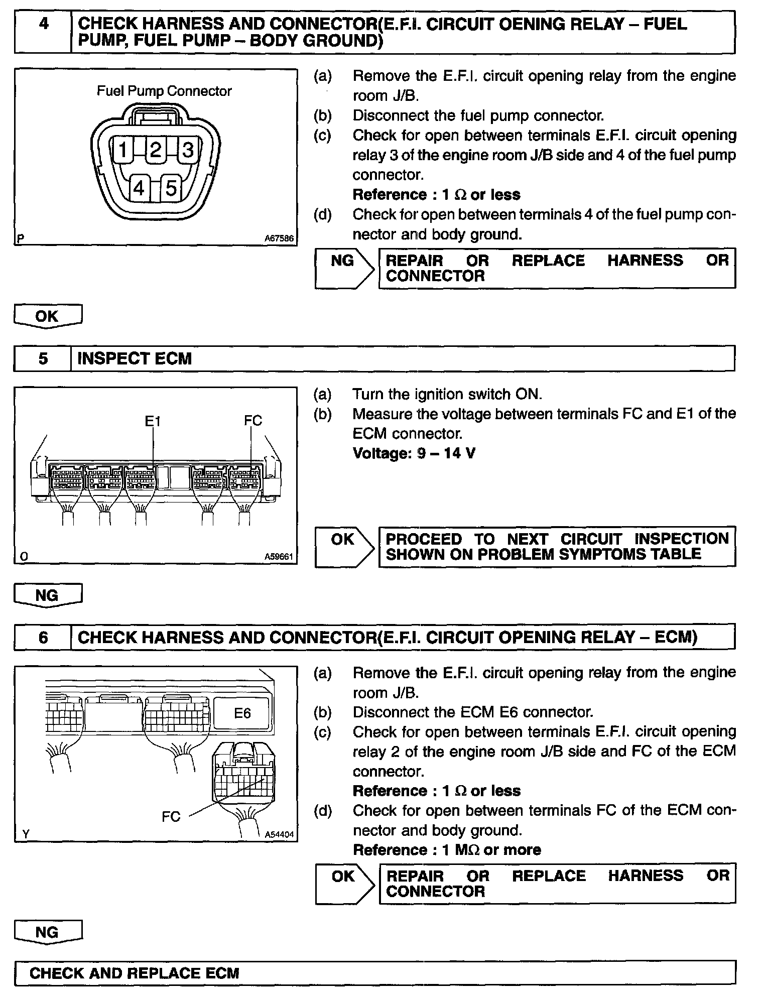 When the STA signal and NE signal are input to the ECM, Tr is turned ON, current flows to the coil of the E.F.I circuit opening relay, the relay switches on, power is supplied to the fuel pump and the fuel pump operates.
