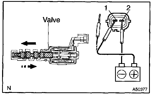 Connect the positive (+) lead from the battery to terminal 1 and negative (-) lead to terminal 2, and check the movement of the valve.